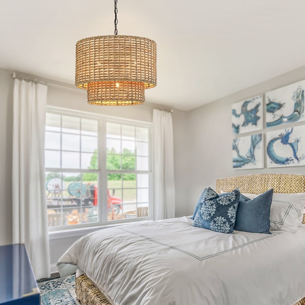 This pendant chandelier light is meticulously hand woven of natural wicker and rattan in an oversized 2-tier drum silhouette. Inside, a 4-light cluster in matte black casts generous light and creates interesting shadow patterns on the walls of your entry, dining room or bedroom.
