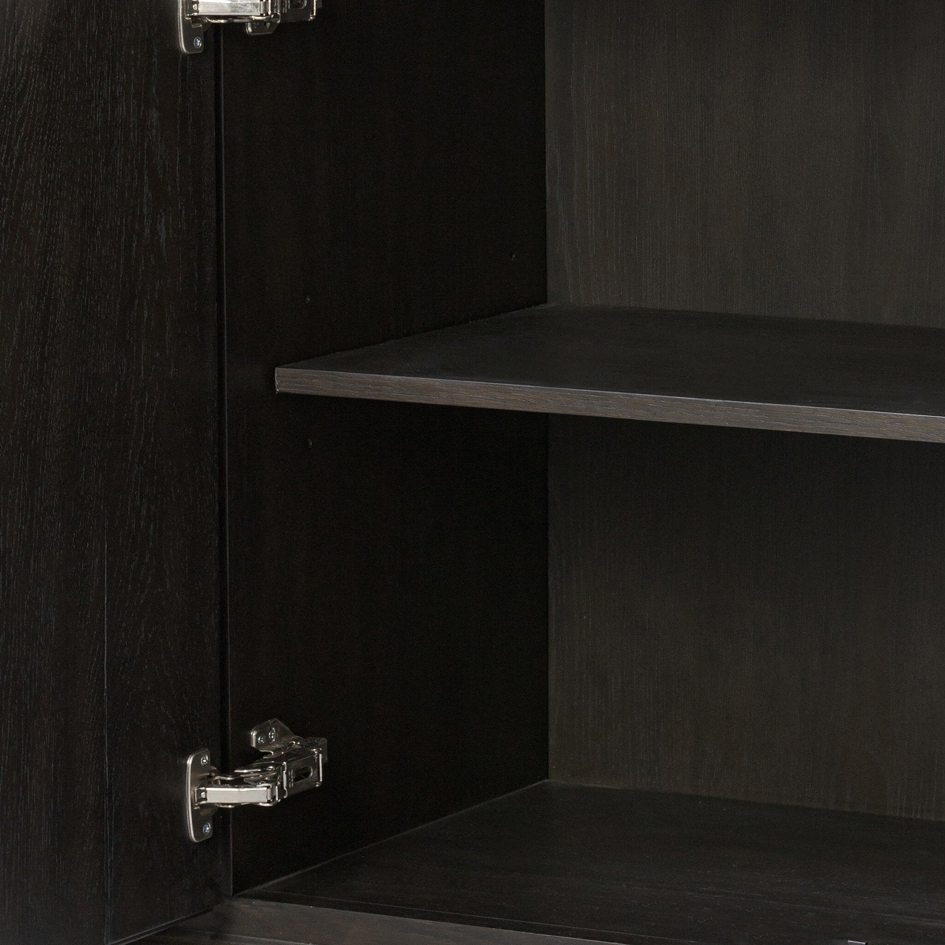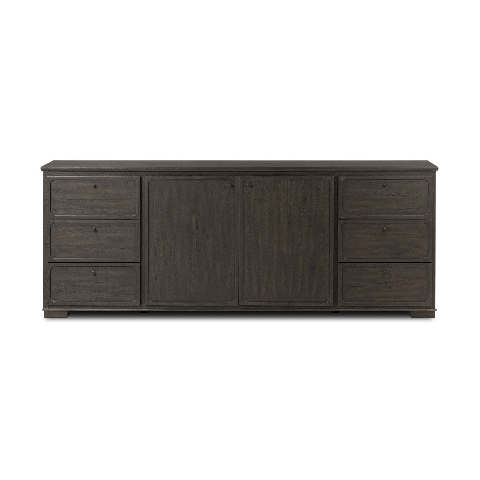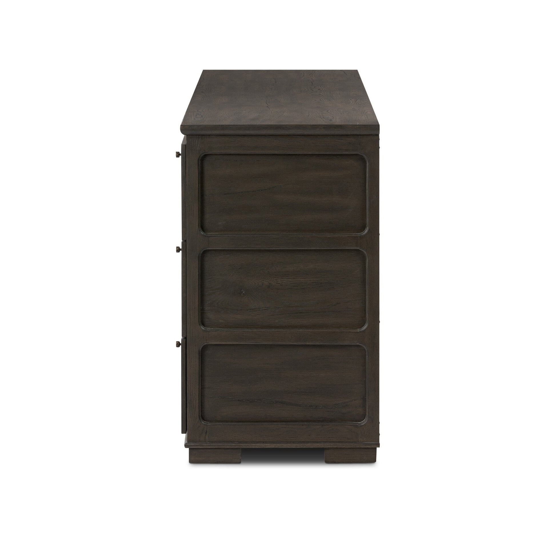 Modern Deco style meets a strong, traditional aesthetic. Each side has three drawers with rounded molding and hammered hardware, while a black oak finish with brown undertones reveals the wood's natural grain.