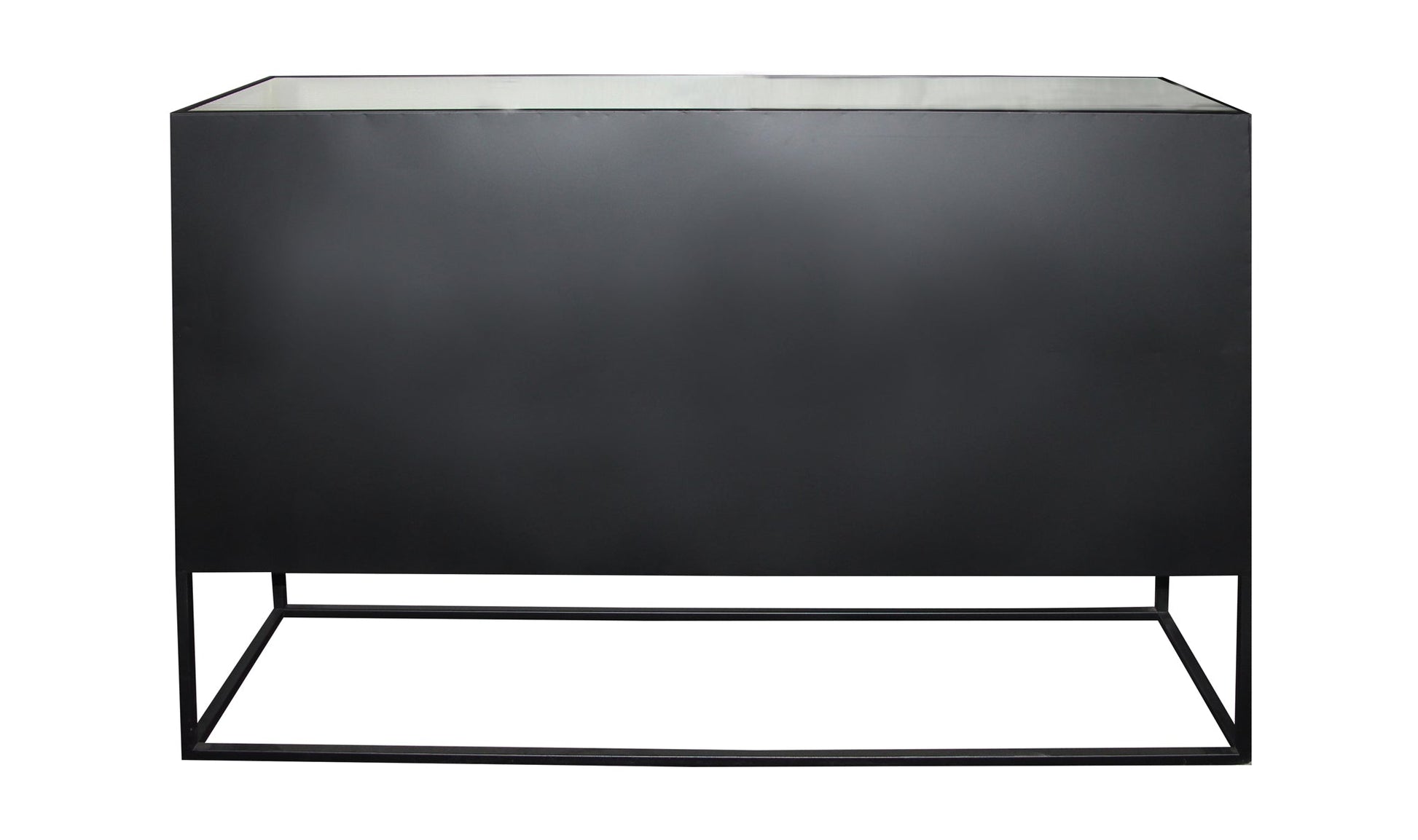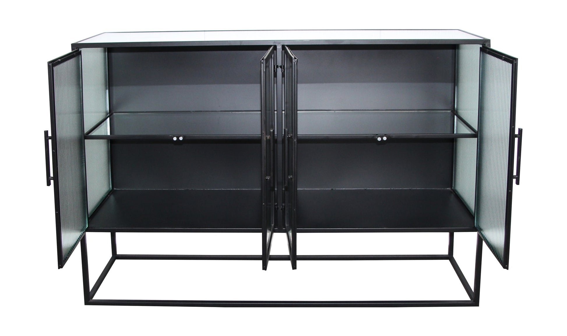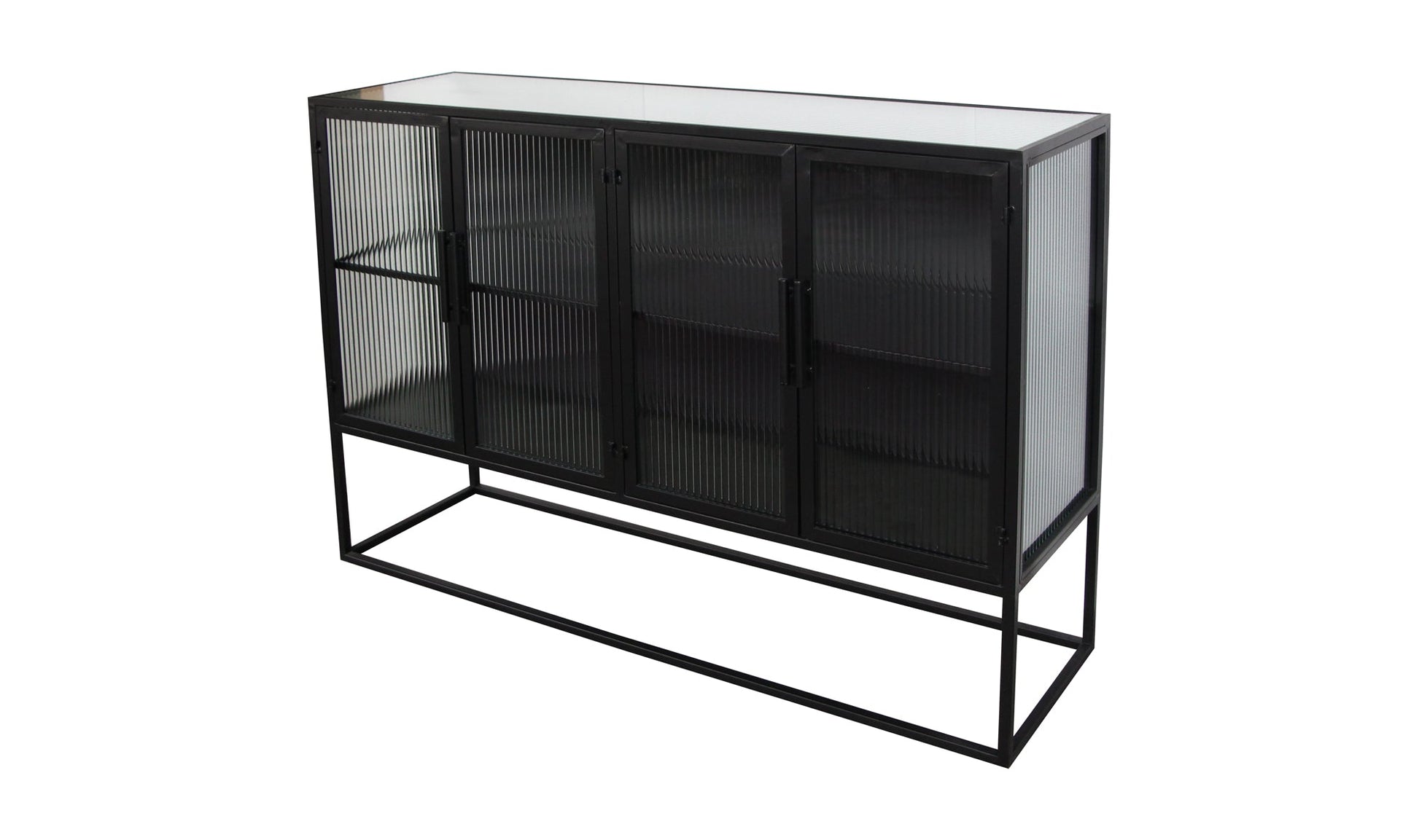 This tough, industrial luxe cabinet is a definite answer to your storage dilemmas. In a clean-cut iron frame with vertical handles, four soft-close cabinet doors, and beautifully ribbed glass front and sides, this glass-shelved unit is ideal for the living or dining room. The Lita is versatile, functional décor for your display- you could even try it out as a bar arrangement with glassware and mixes stored underneath.