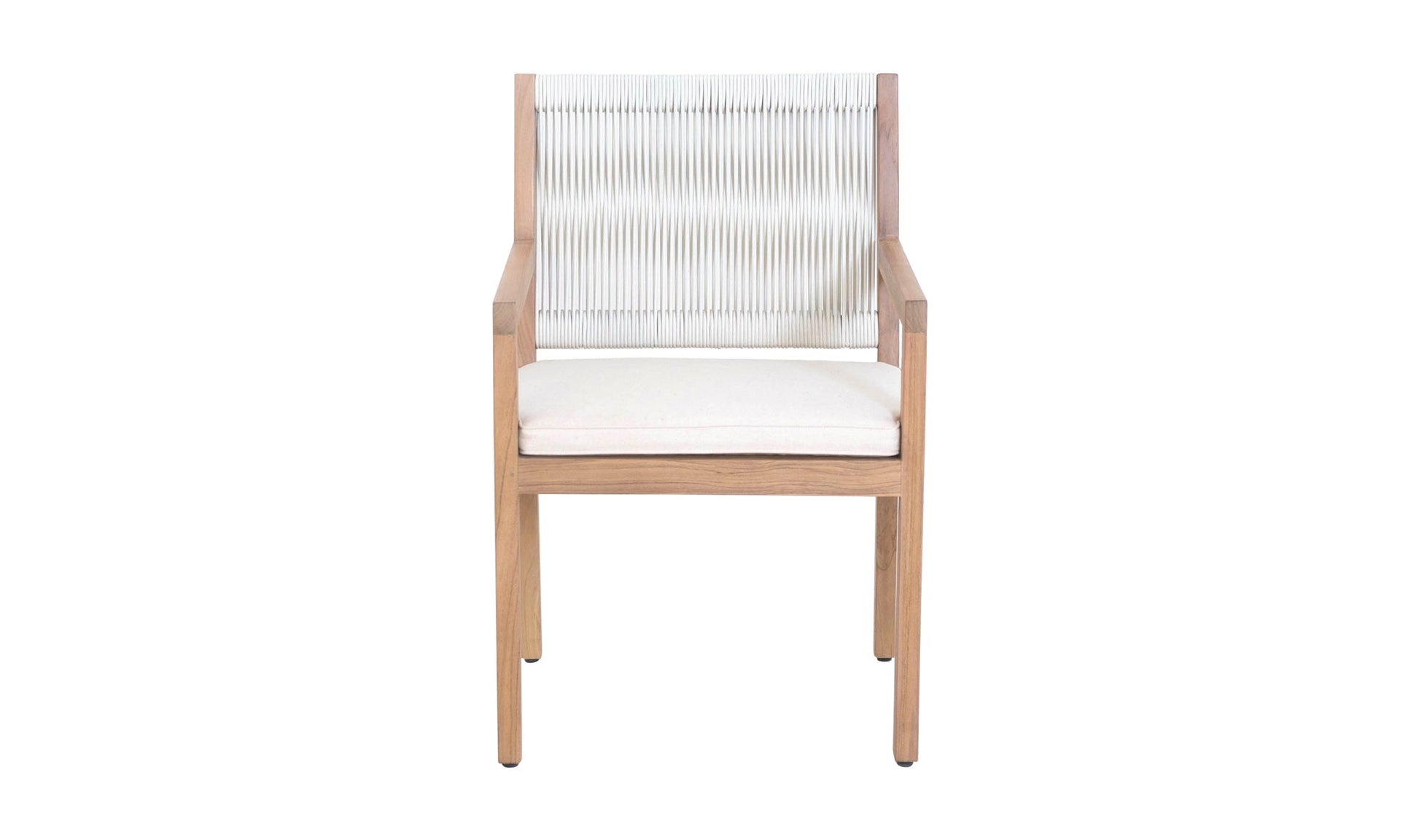 Let the sunlight shine bright on the beautiful white synthetic wicker weave of the Luca outdoor dining chair. Its warm teak frame turns into a darker patina over time, while a removable, easy-to-clean ivory white cushion captures the light and dark contrast of this gorgeous piece.