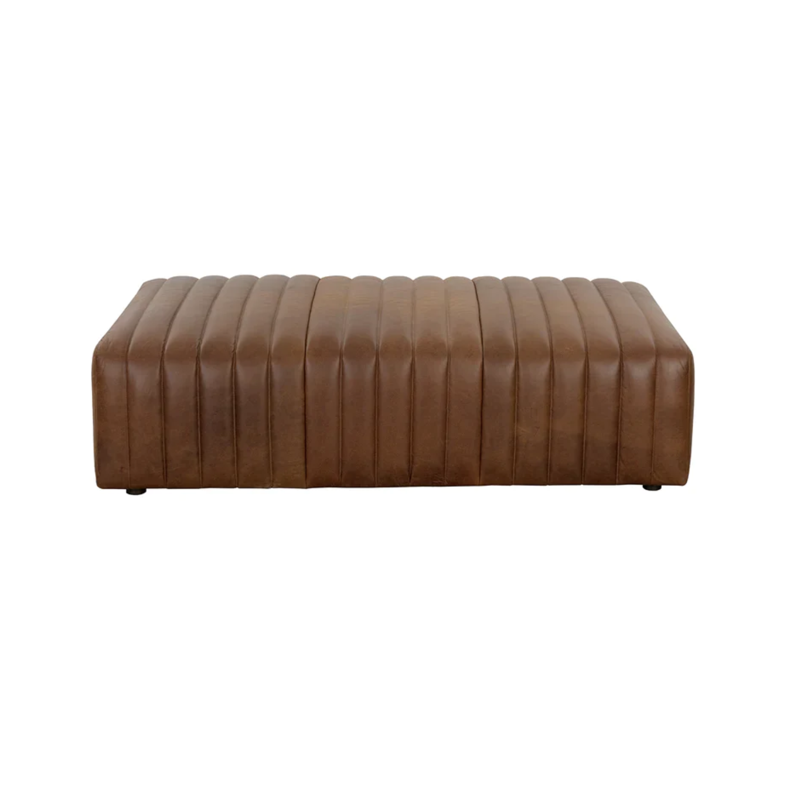 The Lucien Ottoman - Rectangular offers an opulent style, thanks to its aged cognac leather, vertical tufting, and lavish texture. This luxurious piece will elevate any room's decor.
