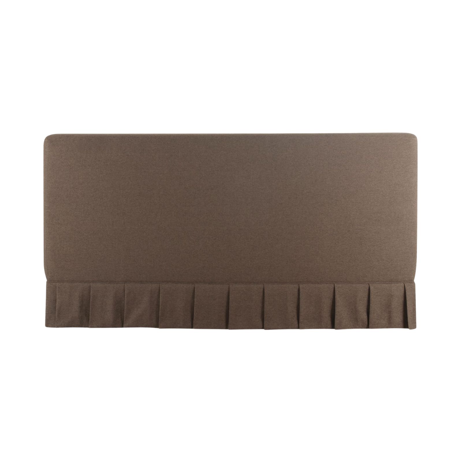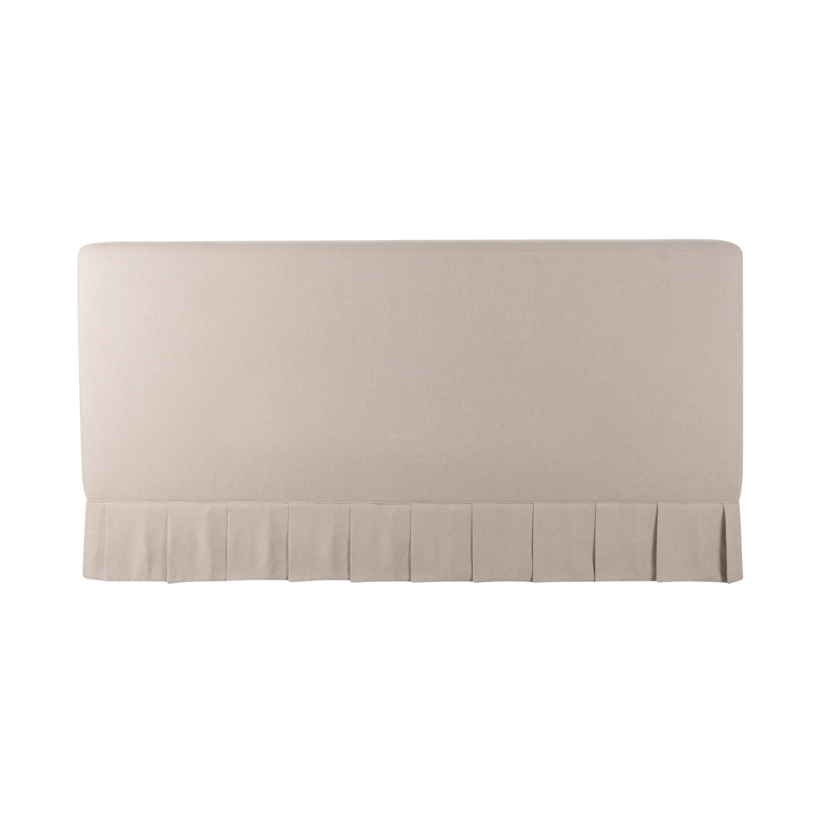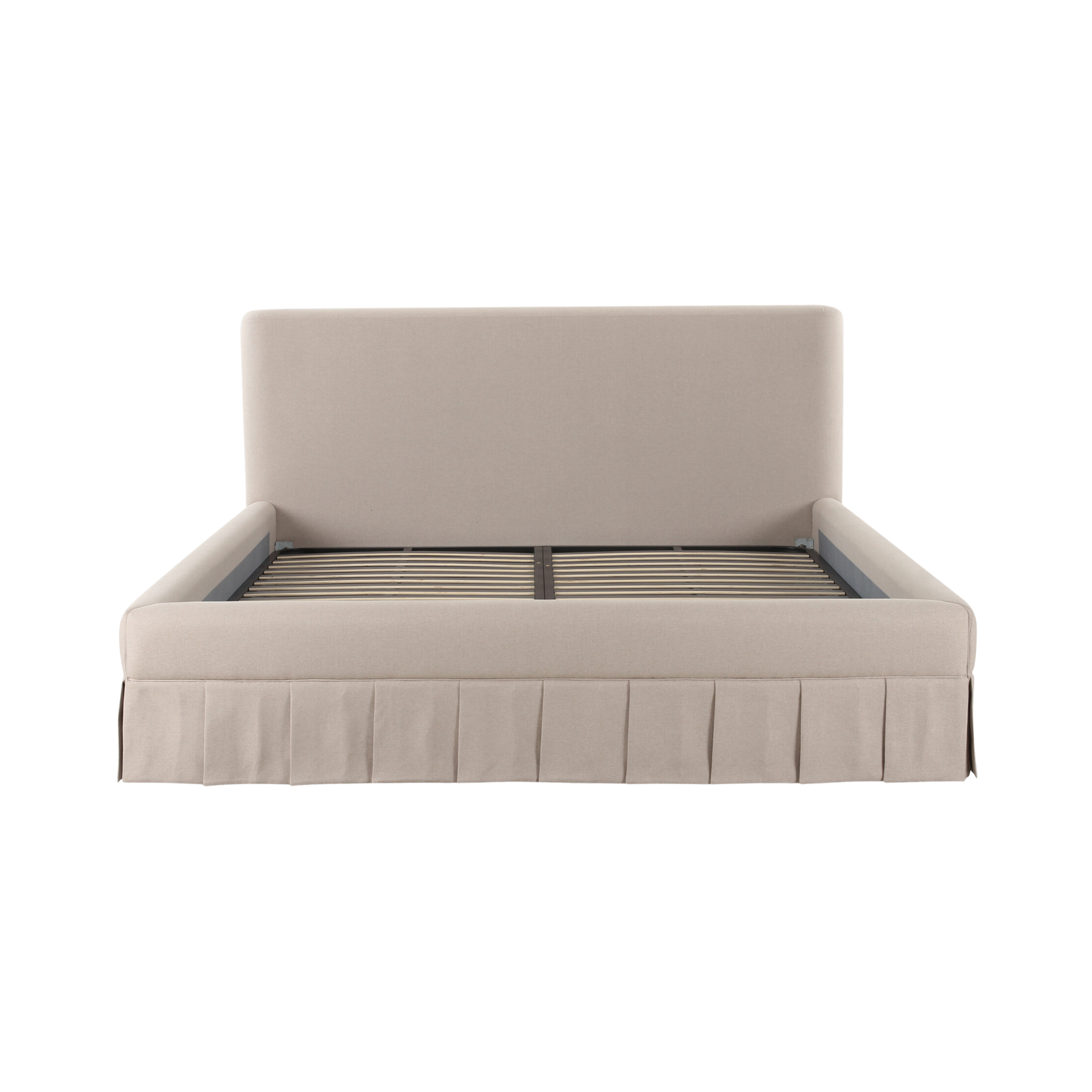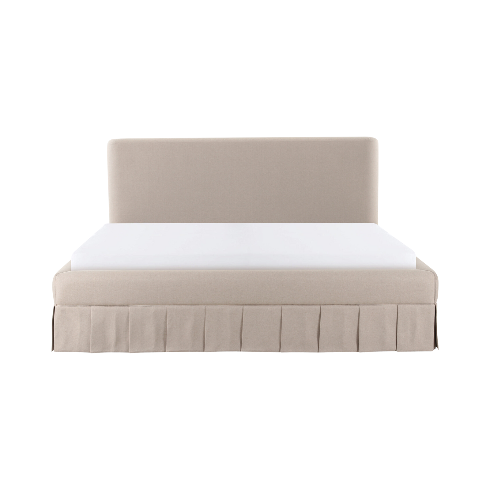 The Mallory bed exudes a soft, feminine aesthetic, upholstered in a warm, neutral fabric and featuring a playful yet refined box pleat base reminiscent of vintage finesse, straddling the line between contemporary form and traditional finish. With smoothly rounded corners and graceful, curving forms adding softness to the design, this piece is a study in elegance and subtlety.