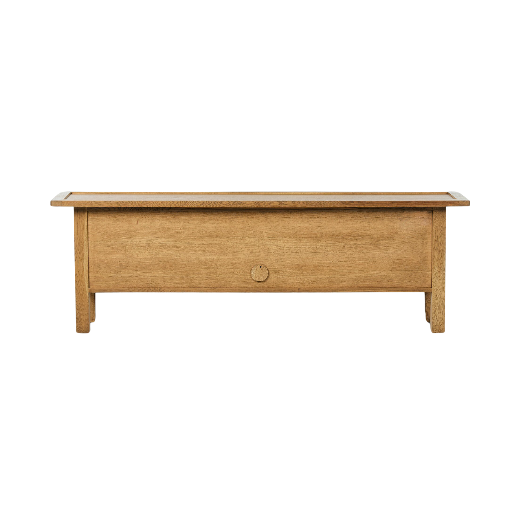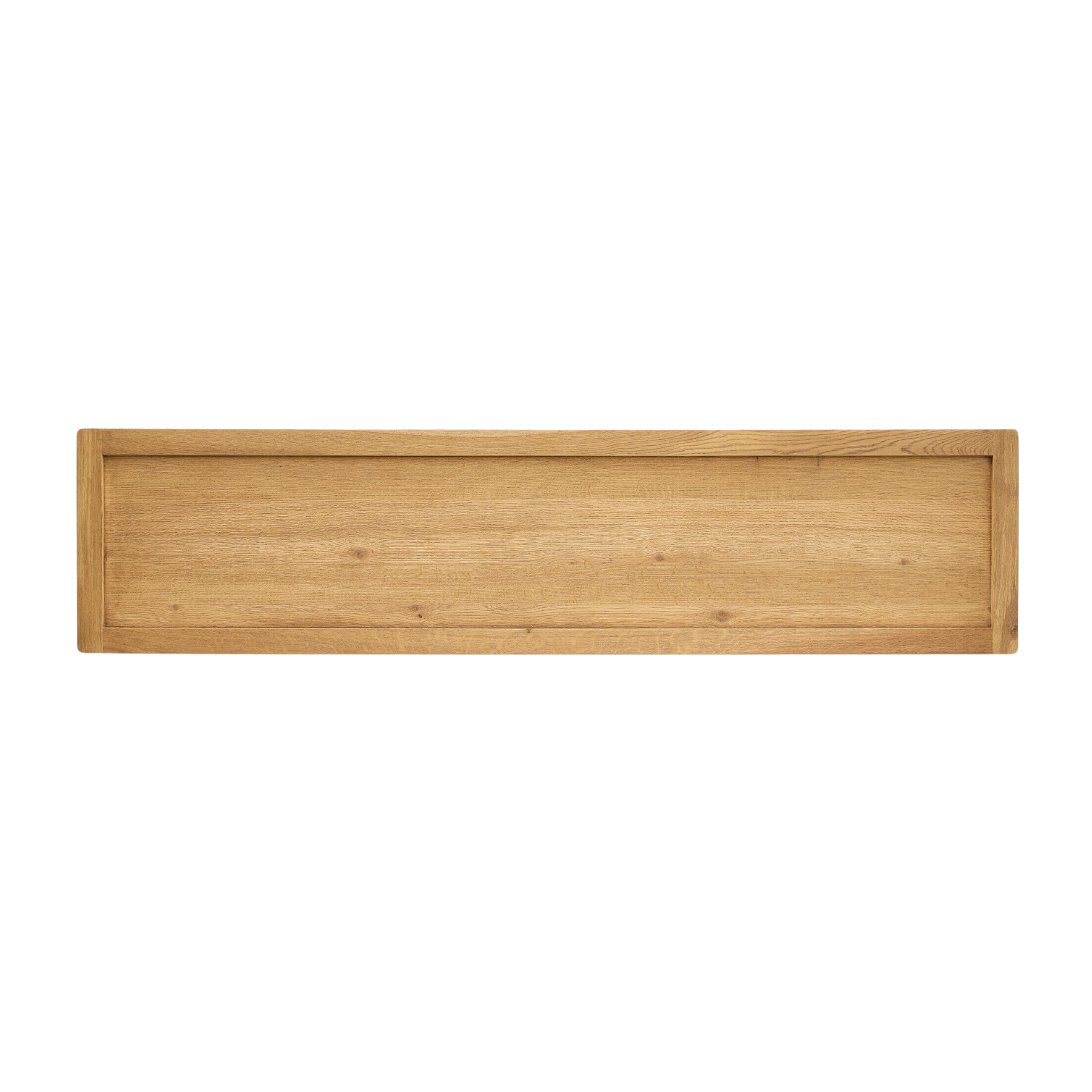 Inspired by a vintage general store counter, this console table features a heritage design with a modern twist. Thick oak legs with softened corners provide sturdy support, while oak knobs add a touch of classic charm. The inset tray top and varied drawer configuration offer ample storage.