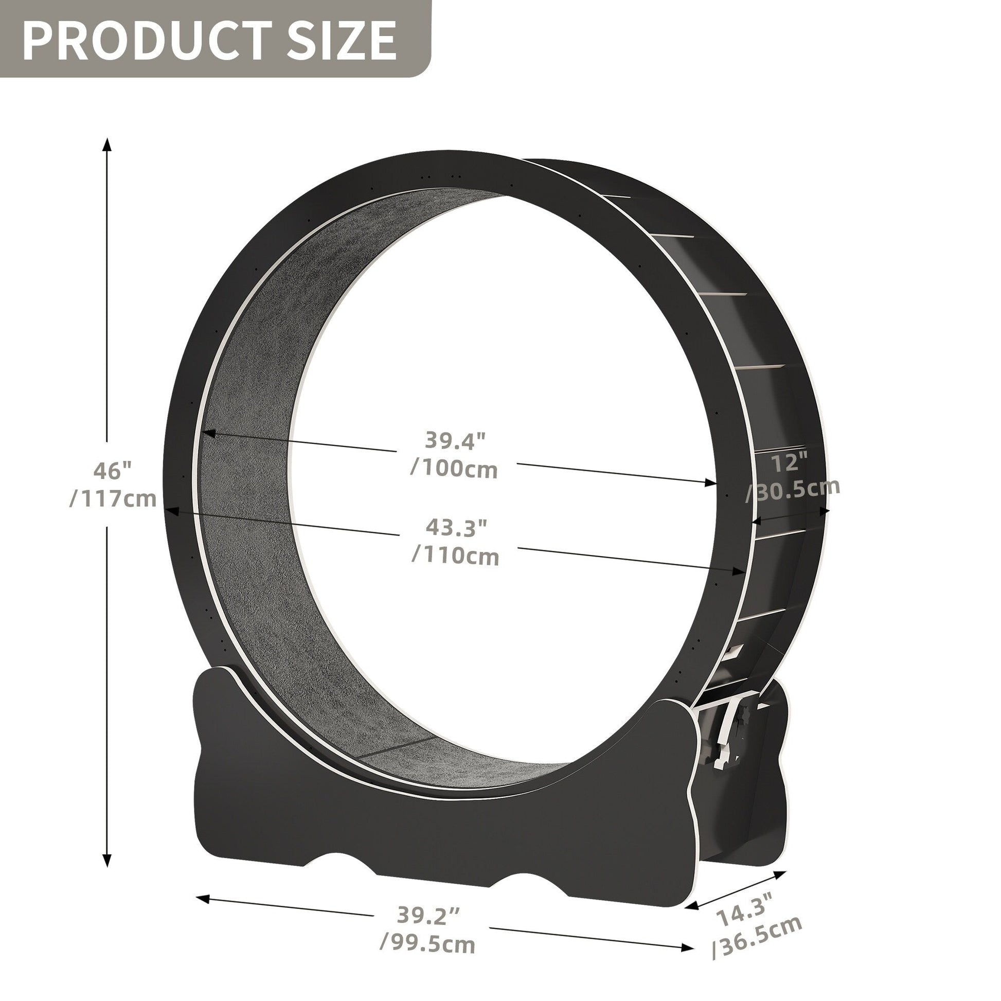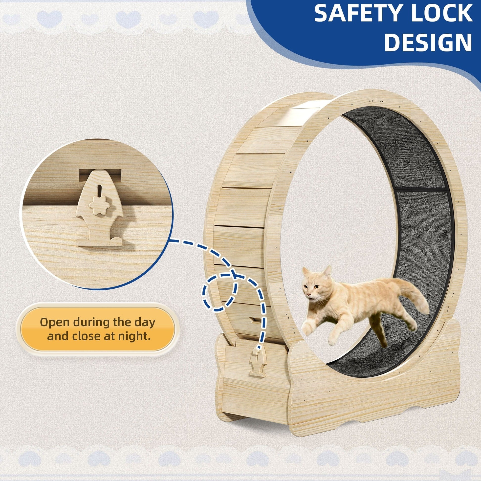 The Cat Treadmill is designed with cats' preferences in mind, stimulating their playfulness and promoting their overall health. Its sturdy and durable structure can withstand daily use and play, featuring a 35.8-inch diameter wheel with a non-slip carpeted interior. This robust cat running wheel provides hours of entertainment for your feline friend. Additionally, the treadmill is equipped with a fishbone-patterned lock latch that secures the wheel when not in use, ensuring noiseless exercise.
