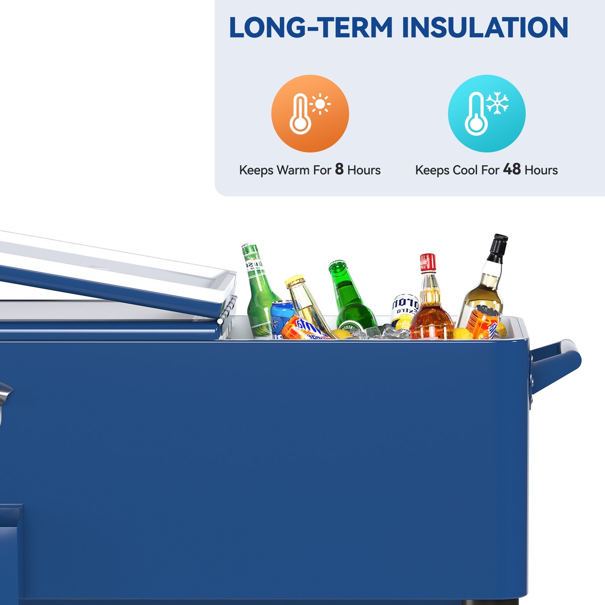 Elevate your outdoor entertaining experience with our 80-Quart patio cooler, offering ample storage capacity to keep over 100 cans or 55+ bottles cool for up to 48 hours or warm for up to 8 hours. This portable cooler cart is designed for convenience, featuring 360° swivel wheels, ergonomic handles, and extra storage space for a seamless outdoor chilling or warming experience.The patio cooler can store over 100 cans or 55+ bottles, keeping beverages cool for up to 48 hours or warm for up to 8 hours. Perfect for outdoor gatherings or events, it ensures you have a generous selection of drinks readily available.Highly portable, the cooler cart can be easily assembled and detached for convenient carrying during travels. Take it with you to picnics, camping trips, or any outdoor adventure effortlessly.Featuring 360° swivel, lockable wheels, the outdoor cooler offers easy maneuverability in any direction. Transport the cooler smoothly from one location to another, whether you're hosting a backyard party or heading out for a camping trip.Designed for user convenience, the standing cooler is equipped with sturdy and ergonomic handles on both sides, enhancing mobility and ensuring hassle-free transportation wherever you go.The bottom tray of the portable cooler provides additional storage capacity, allowing you to maximize the number of items you can carry. Additionally, a built-in bottle opener with a bottle cap catcher attached on the side offers convenience for opening bottles and collecting caps.