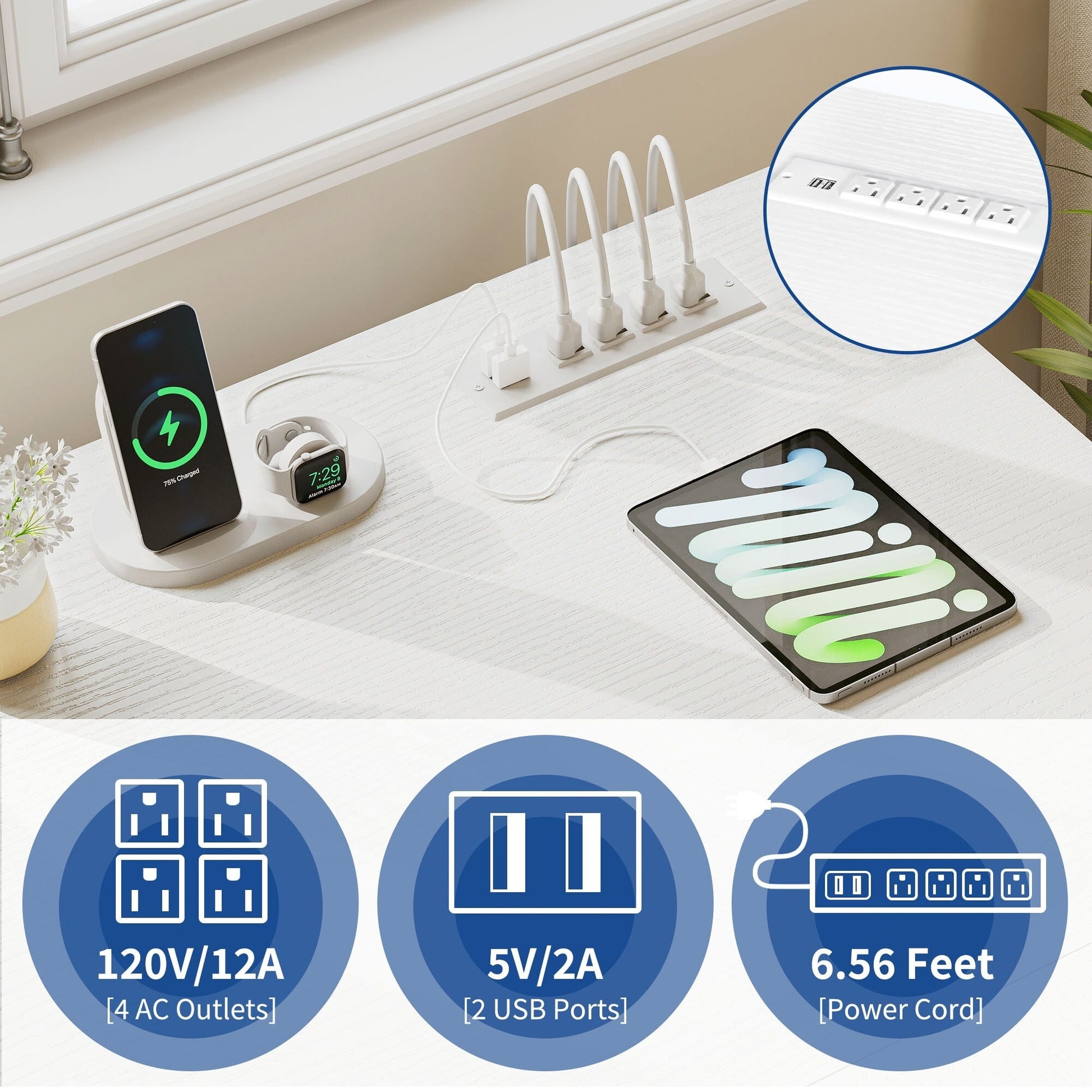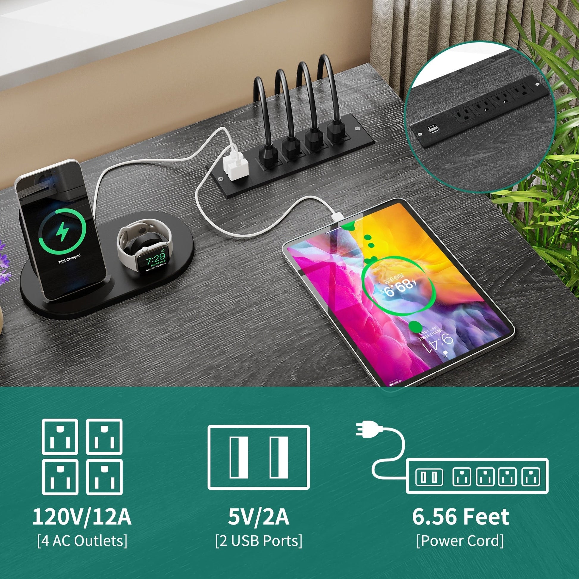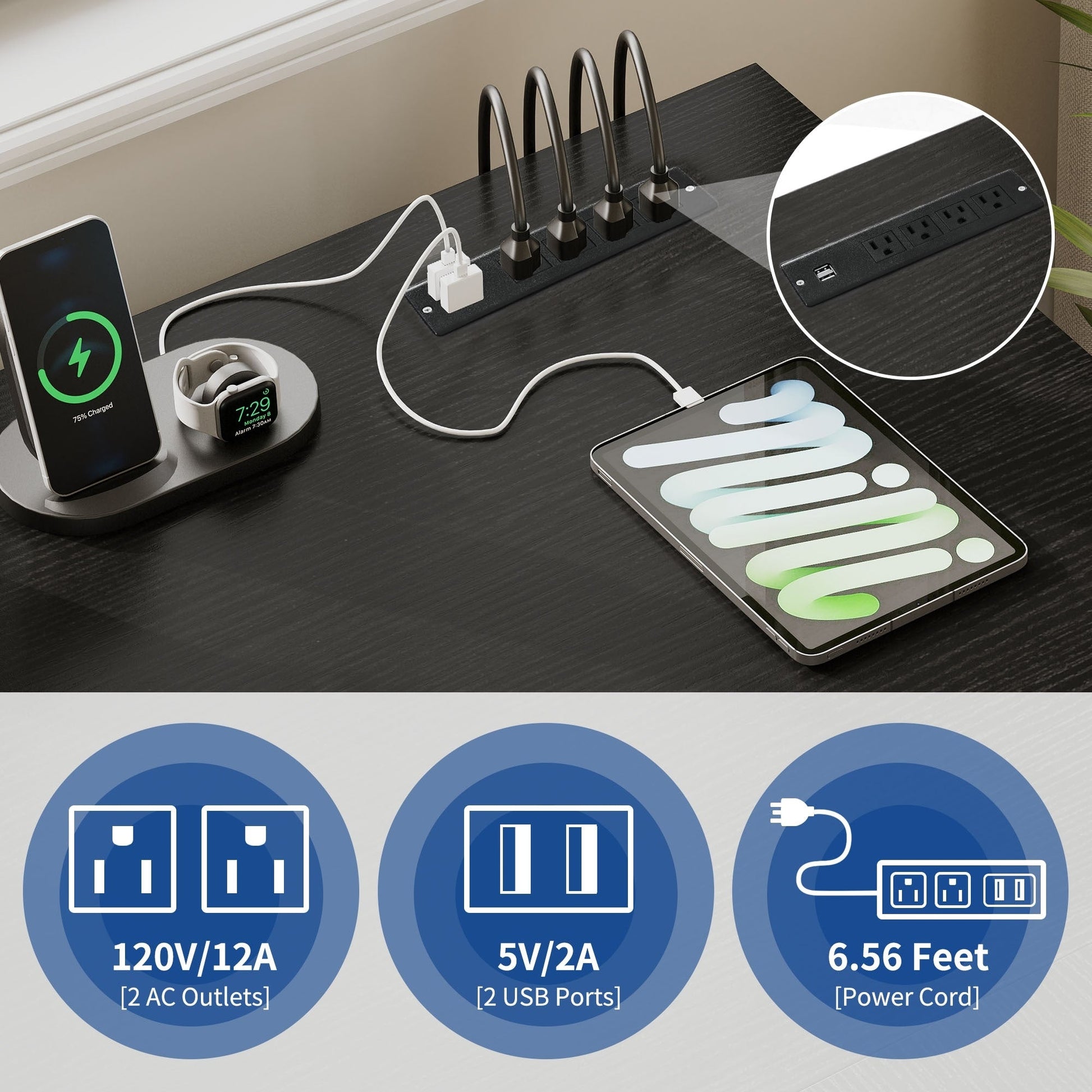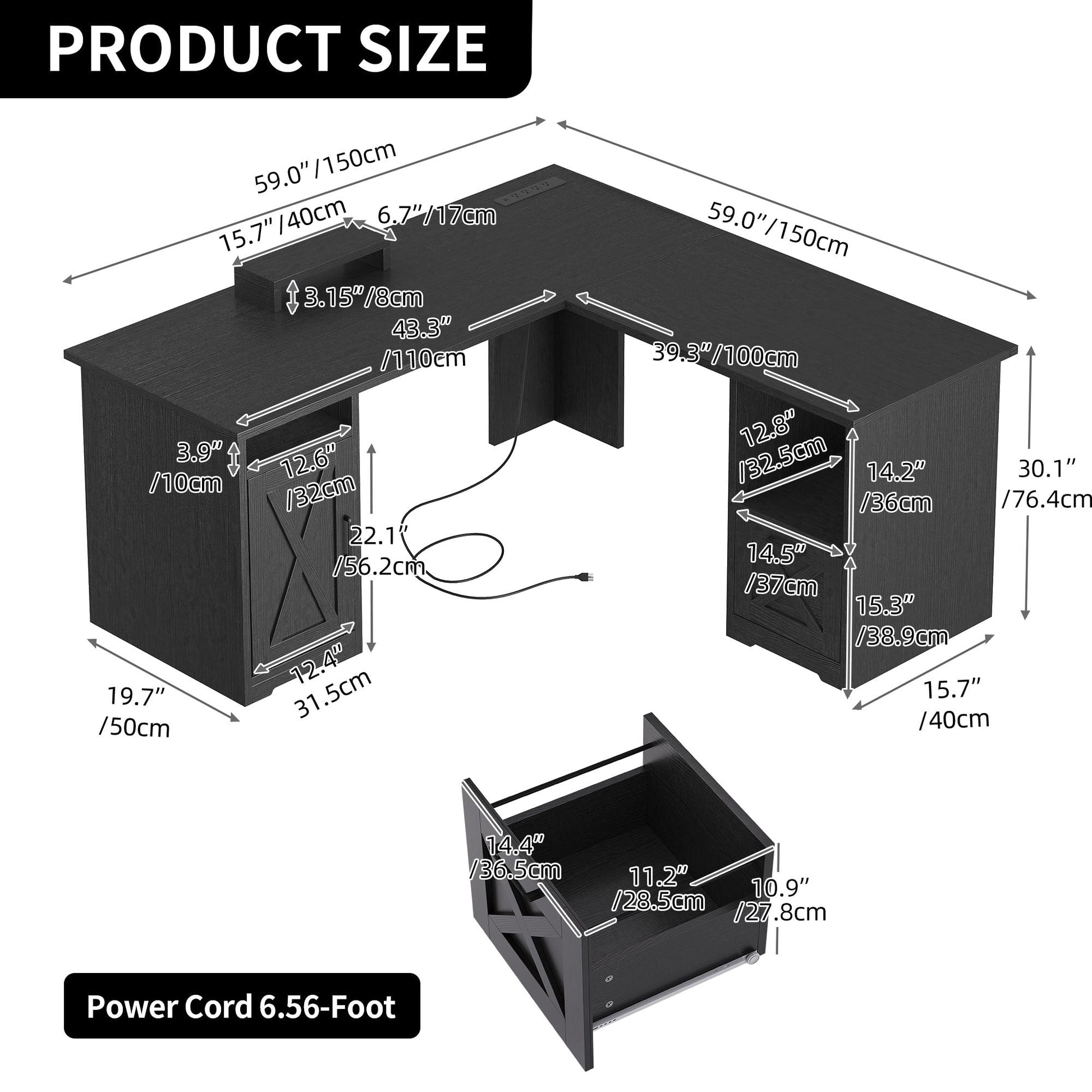 - 1. Charge your devices with ease with this L-shaped desk with drawers. It has 2 USB ports, 4 power outlets, and a 6.56ft power cord to keep your computer, laptop, phone, tablet, printer, and gaming gear plugged in and ready to use.