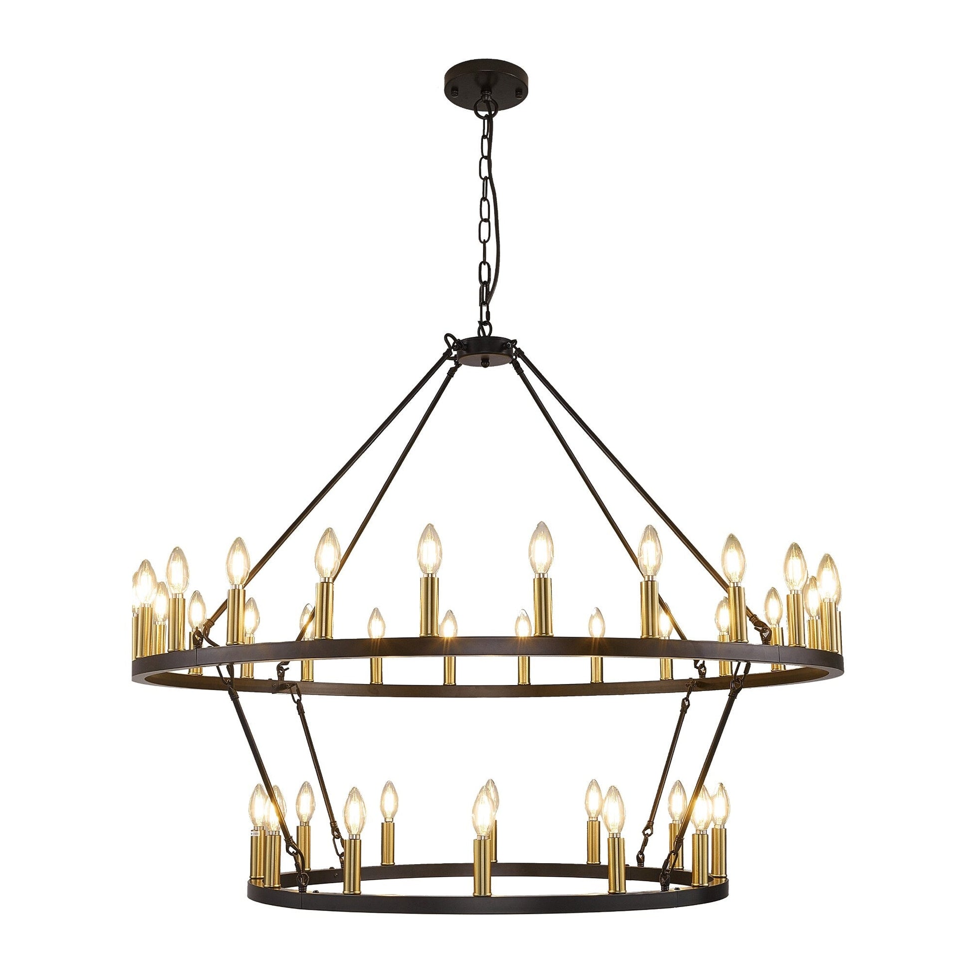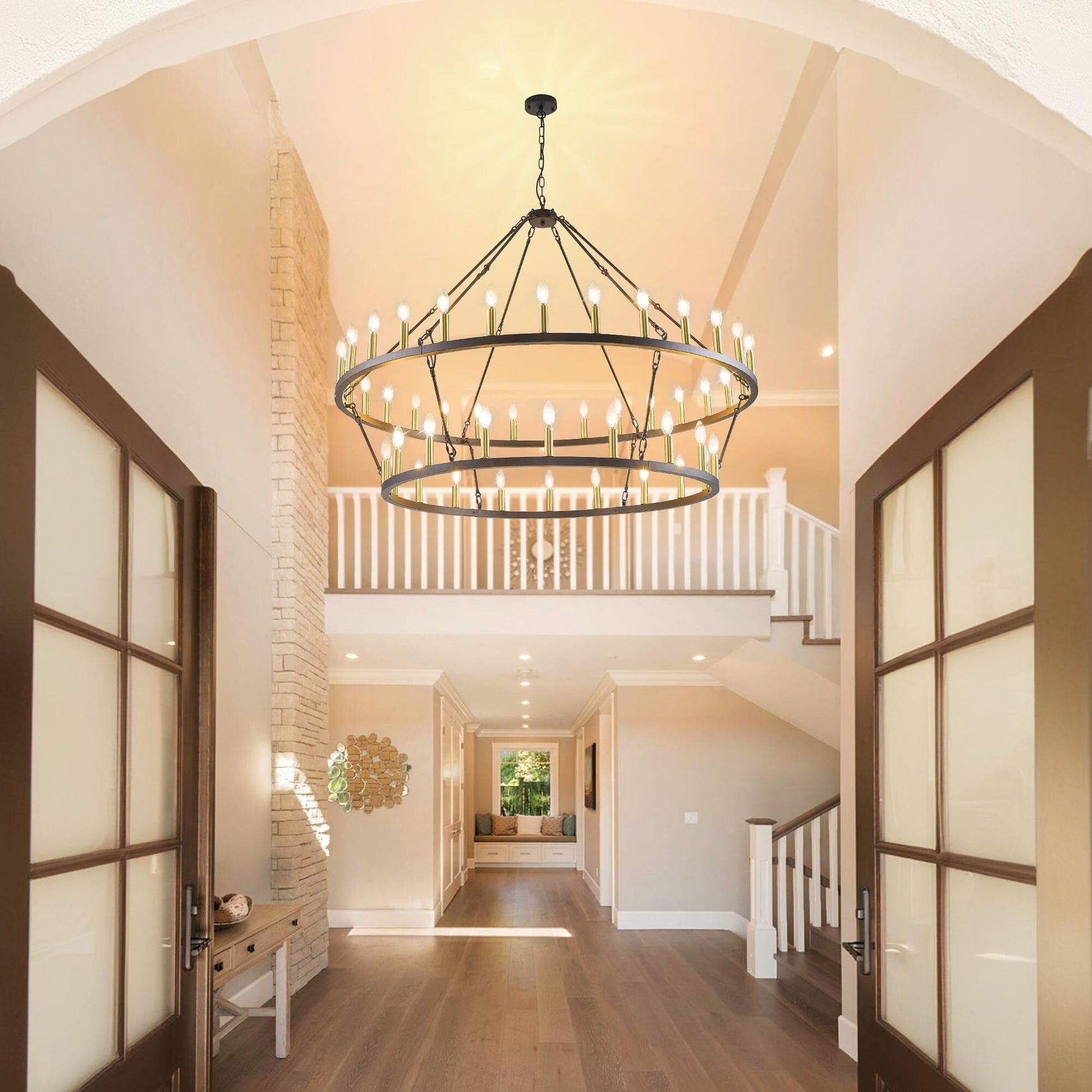 Add a touch of modern farmhouse style to your home with this Modern Farmhouse Chandelier 2 Tier Round Wagon Wheel Chandelier Large High Ceiling Light. This classic chandelier made of hight quality iron, powder-blasted for a matte finish, it is durable. 2 tier total 36 lights provides 360° light coverage, creates a cozy home atmosphere, this large chandelier is perfect for fully illuminating a large space like living room, dining room, and large two story foyer/entryway.