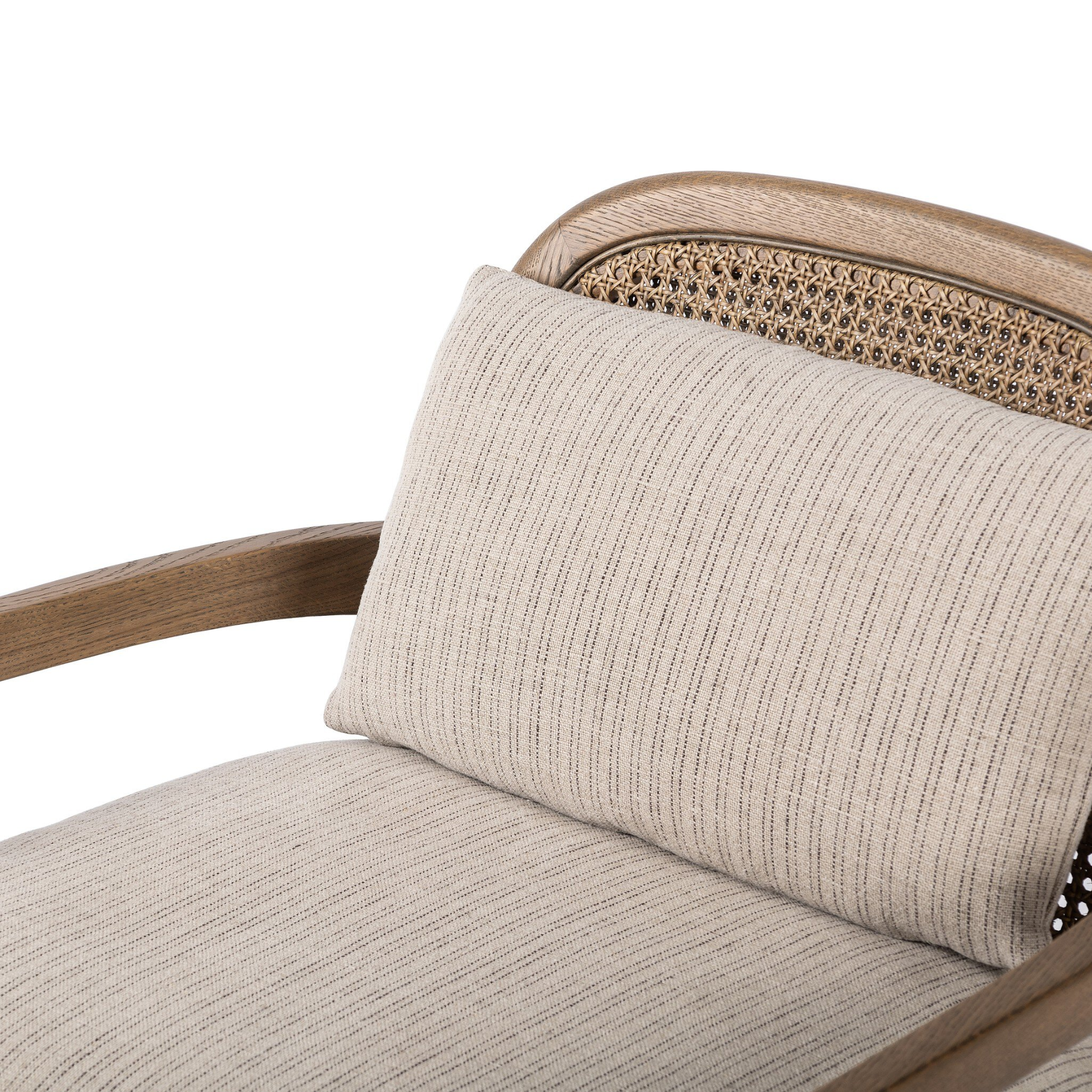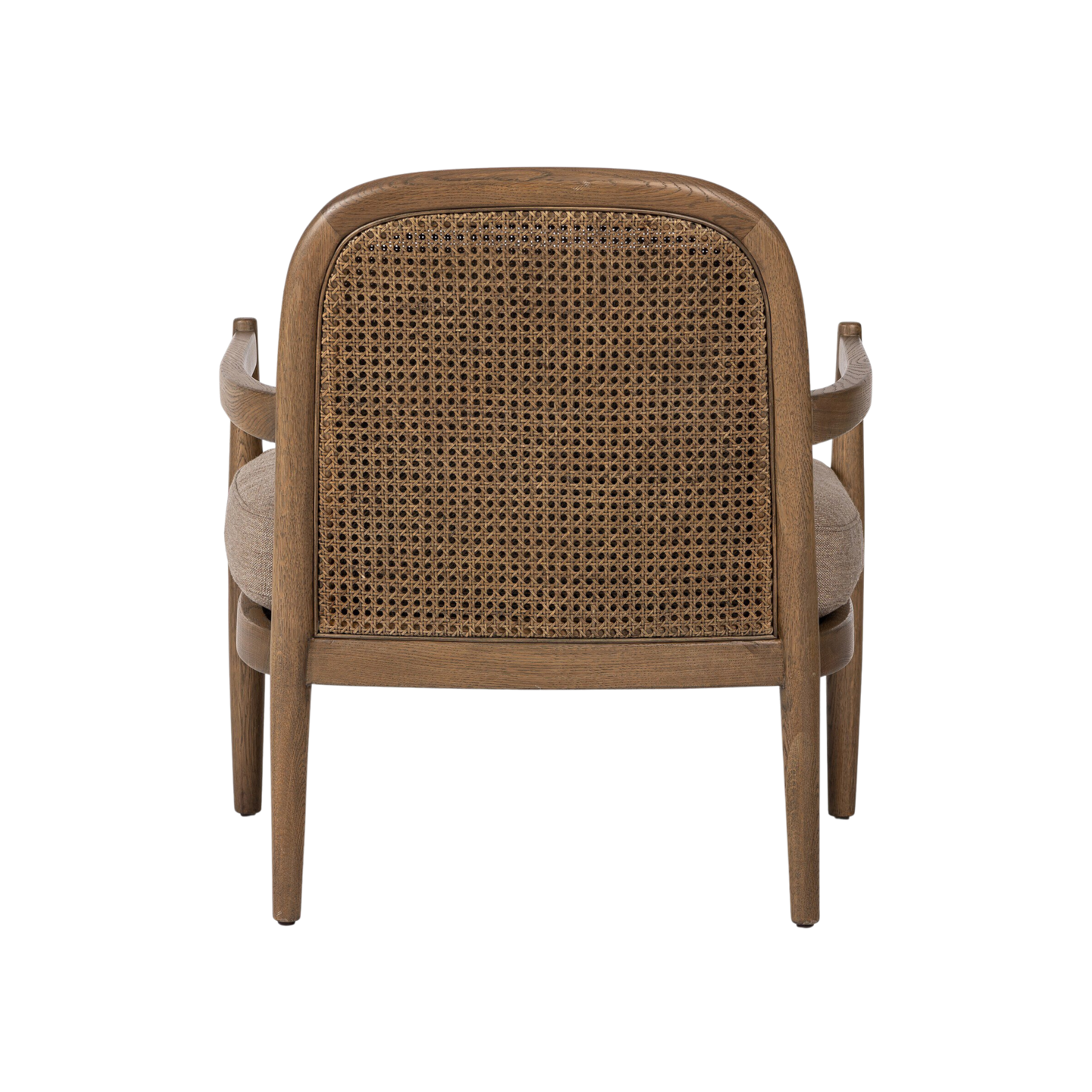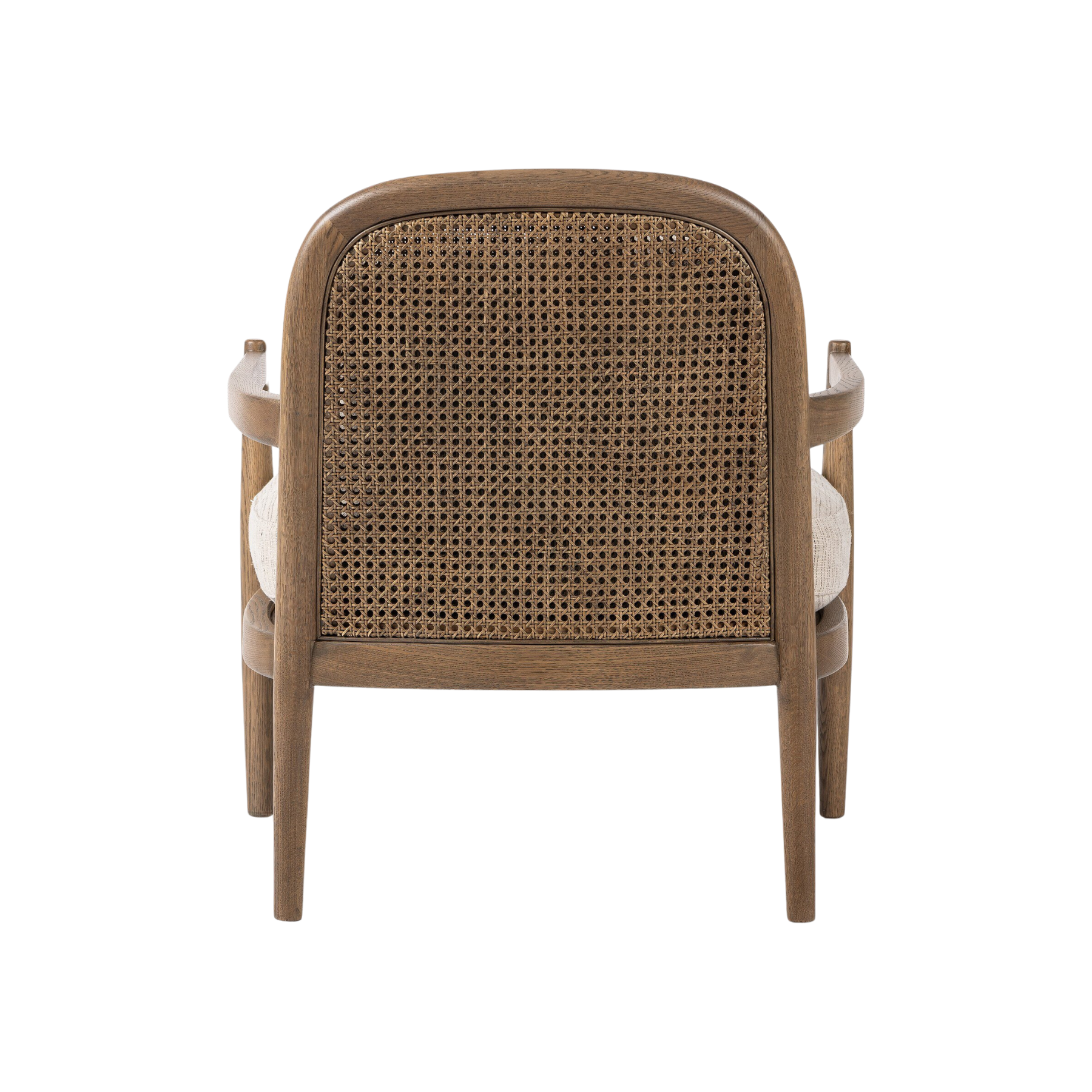Elevate your dining experience with the Nessa Chair. This timeless piece features a light solid oak frame and sleek tapered legs, complemented by a toasted oak cane back. Its loose seat and back cushions, upholstered in your choice of two fabrics, offer both comfort and style.