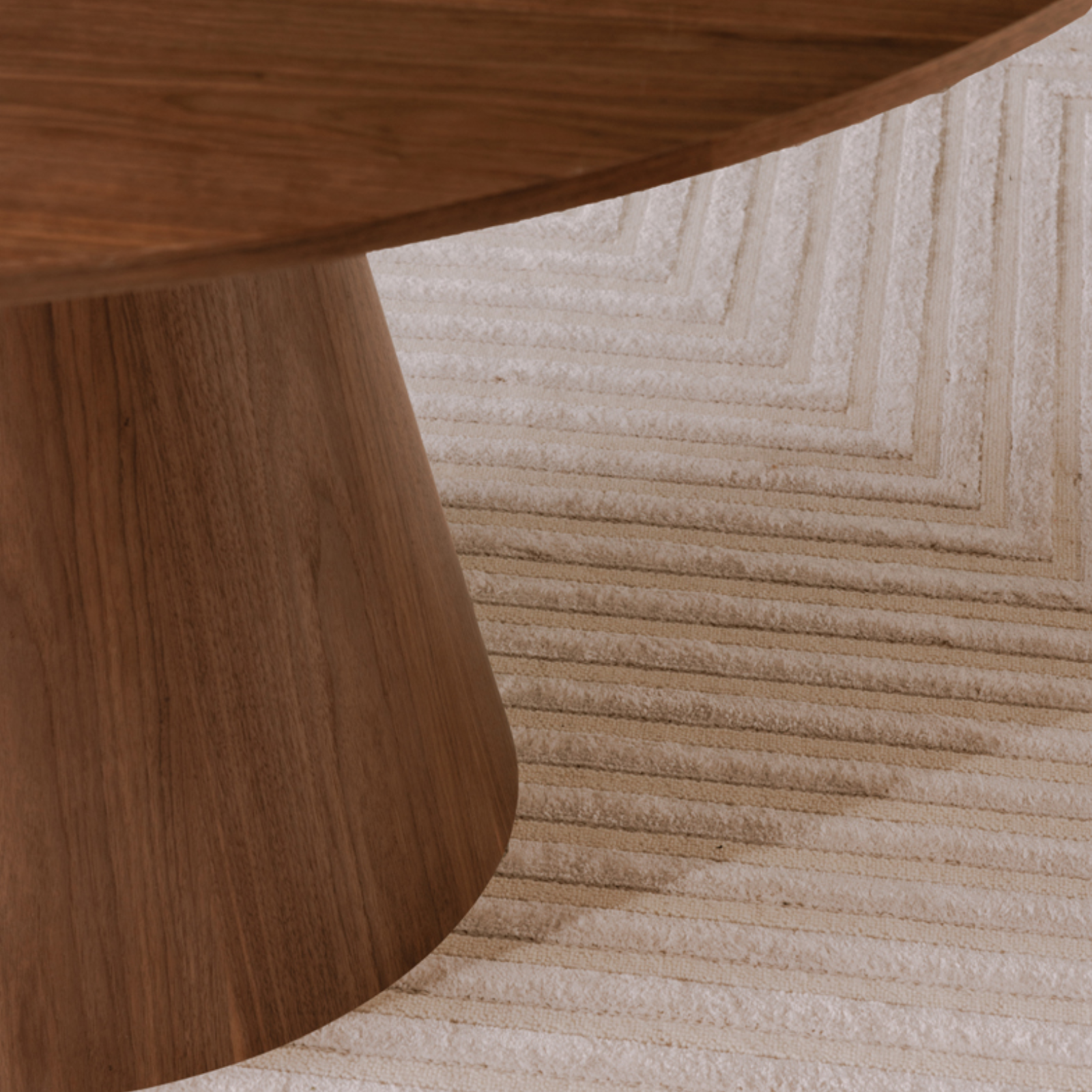 Spanning almost five feet, the circular Ortega dining table can seat up to eight people in style. The all-walnut base and top give this table a sleek, warm aesthetic, allowing it to fit seamlessly into any dining room setting. Ortega semi-gloss, natural walnut finish and sharp geometric design tops off the contemporary feel.