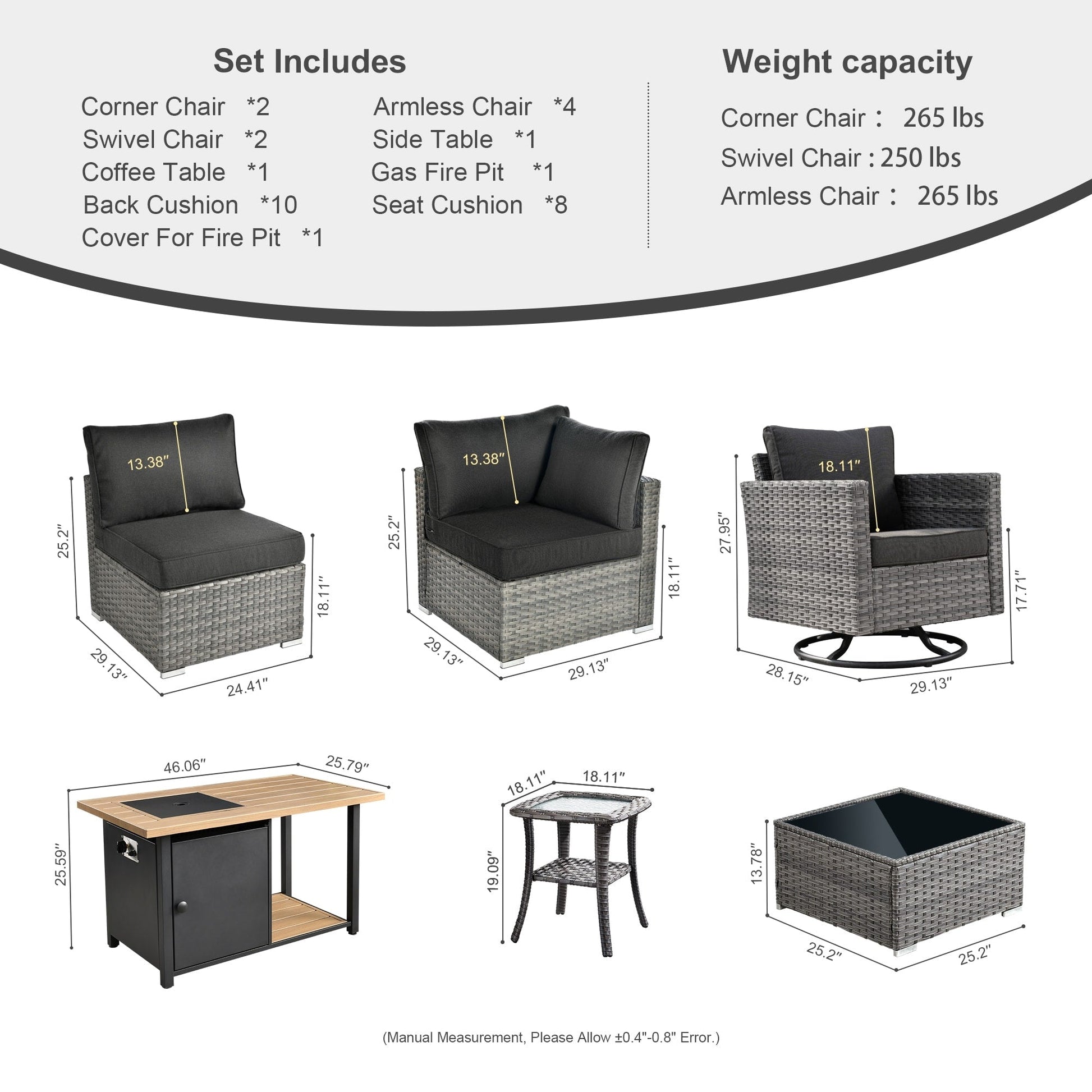 - The set includes 2 corner sofas, 4 middle sofas, 2 swivel chairs, 1 side table and a double-layer fire pit.