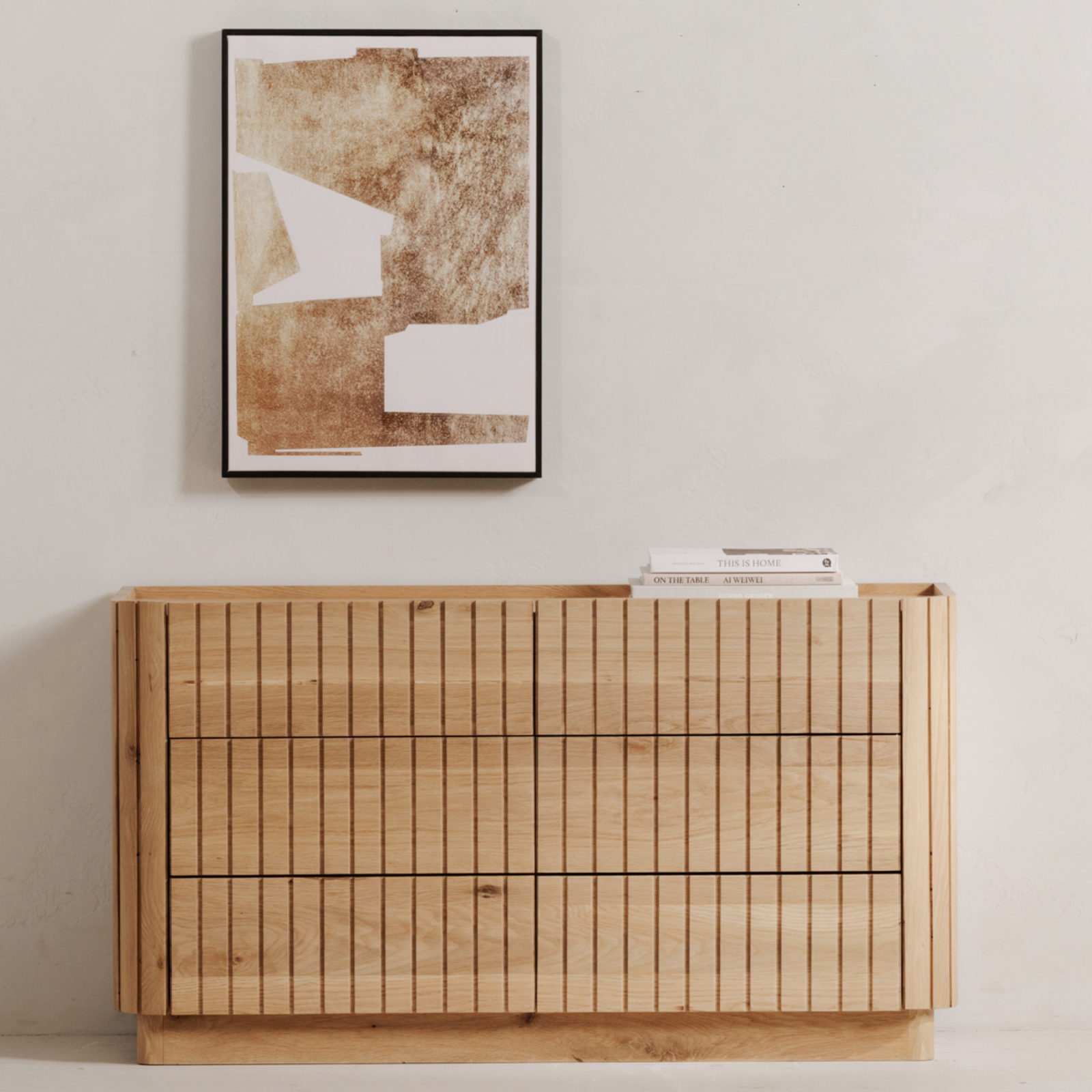 The Penelope 6-drawer dresser balances detail and form offering bold statement appeal and ample storage. This piece anchors the bedroom with its oak facade's gentle ribbing reminiscent of ripples and waves, adding texture and warmth. Naturally beautiful with an impactful silhouette, six soft close drawers open with side mount ball bearing glides.