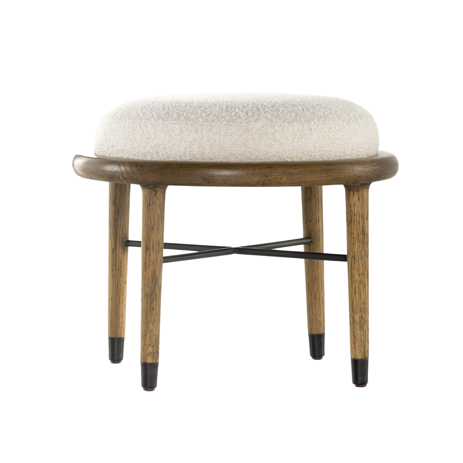 The Persephone Accent Stool flawlessly blends vintage charm with modern functionality. Made with solid oak and upholstered in a textured boucle fabric, it adds style and versatility to any room. The gunmetal-finished iron stretcher and ferrule caps add a sleek touch, while the performance fabric ensures long-term durability. Use it as a seat or surface with ease.