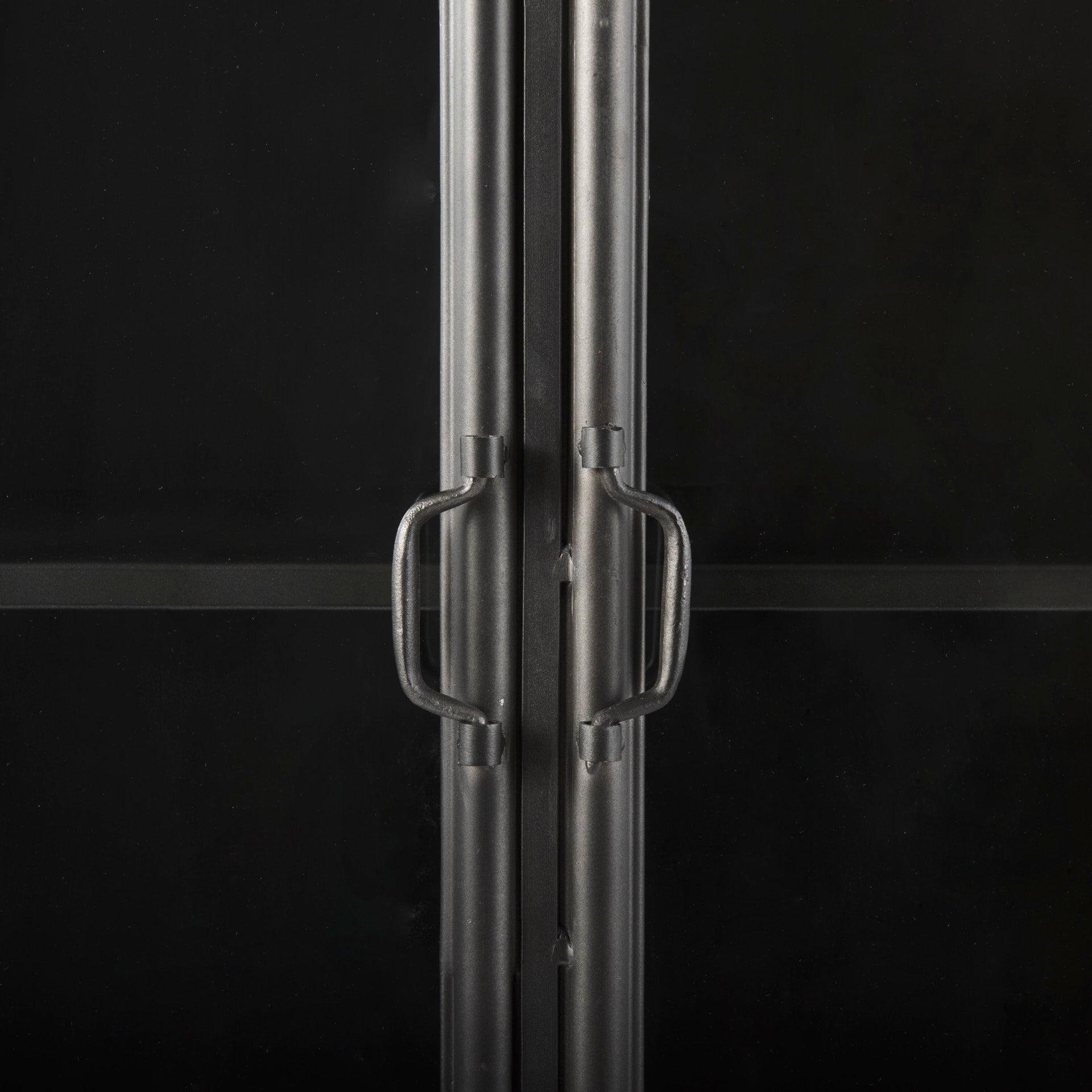 The Piper Cabinet is a full-size display cabinet featuring two large glass-paneled doors. The Piper Cabinet is expertly crafted from black polished metal which not only ensures sturdiness and stability but also completes the Industrial look of the piece.