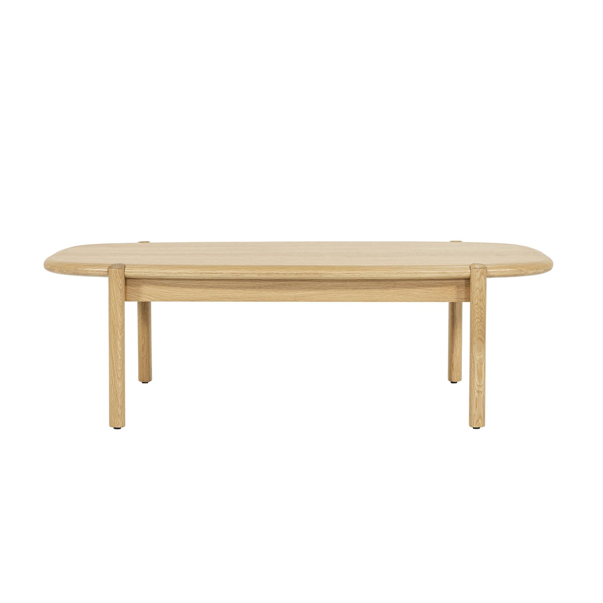 This coffee table features soft curves and the warm hues of light oak, introducing a refined architectural touch to any living space. Crafted from solid oak, it highlights a rich wood grain and gently rounded edges, offering a sophisticated and inviting appearance. Its low silhouette pairs seamlessly with modern lounge furniture, merging minimalist design with expert craftsmanship.