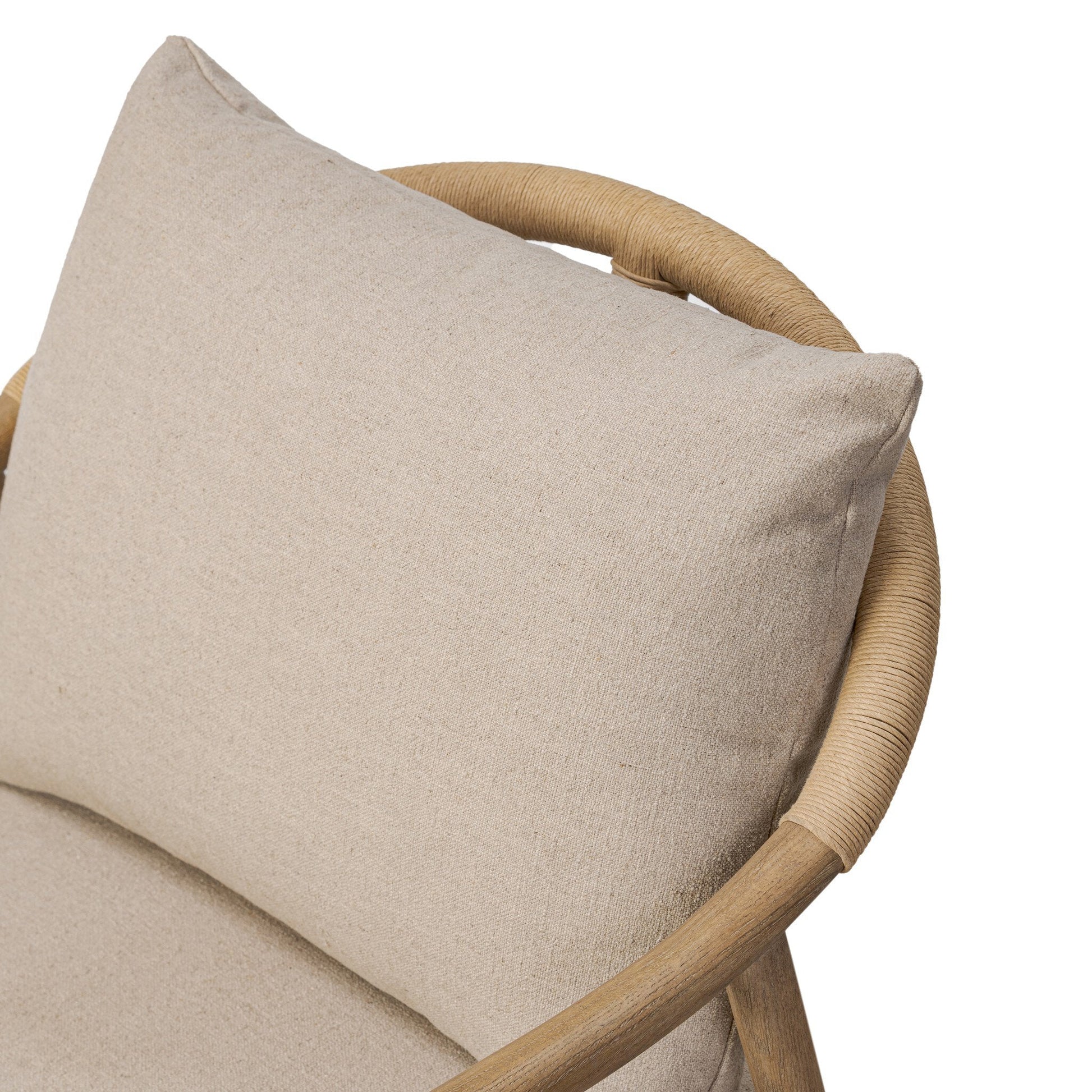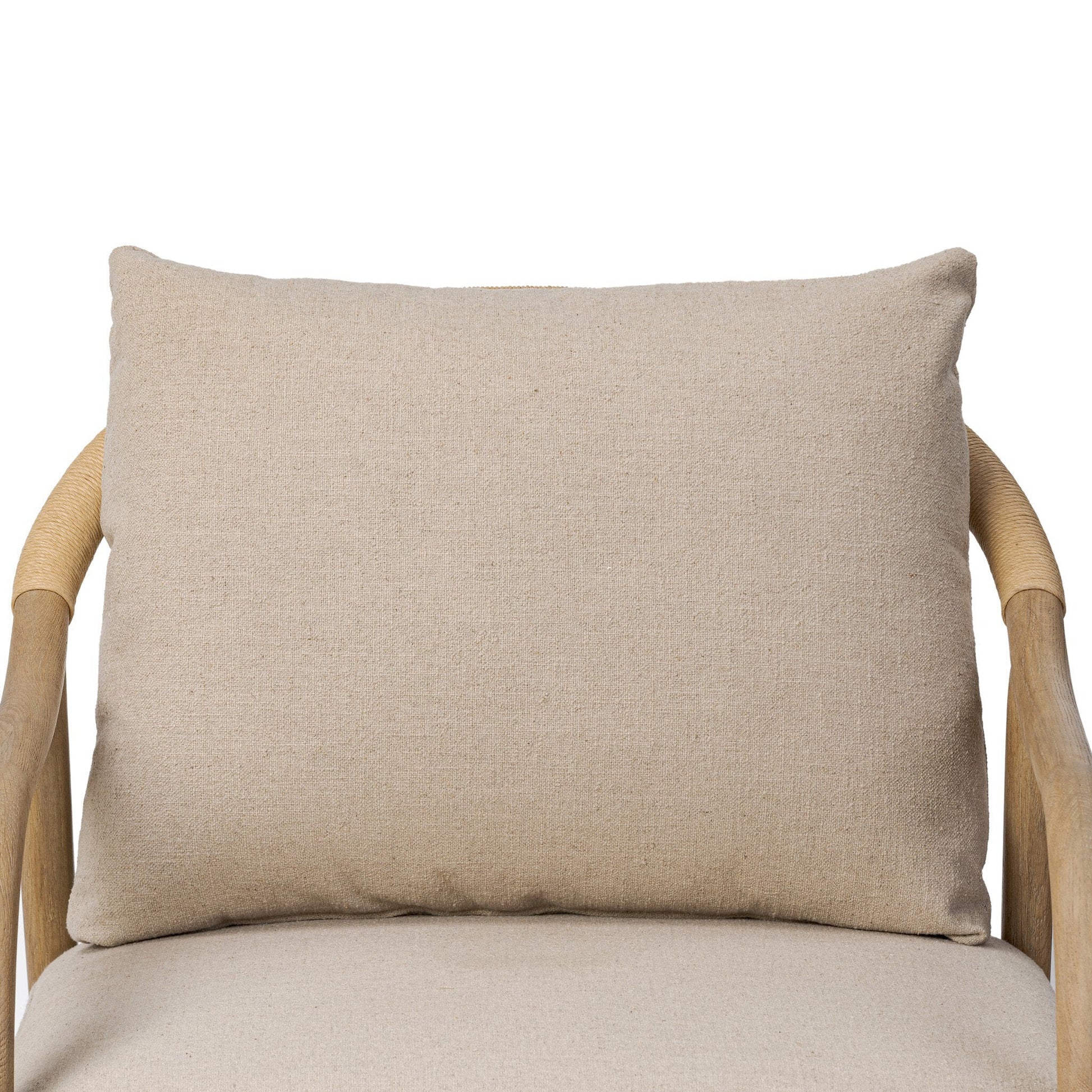 Capturing the ease of tropical ratan seating, an oversized indoor chair is shaped from oak and wrapped with rush cord detailing. Exemplary woodworking is seen in the fluid lines that end with sturdy spindle legs supporting the comfortable S-spring fixed seat and loose cushion, upholstered in taupe burlap fabric. Performance fabrics are specially created to withstand spills, stains, high traffic and wear, ensuring long-term comfort and unmatched durability.