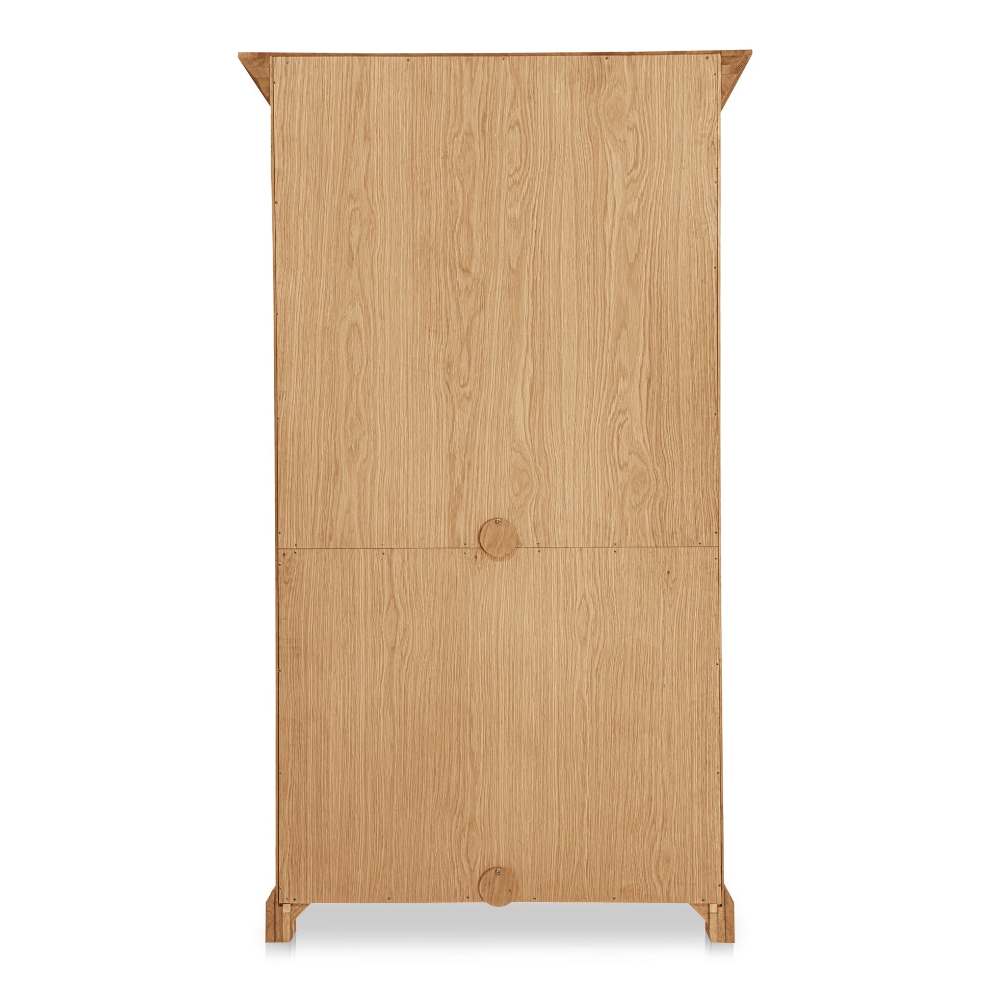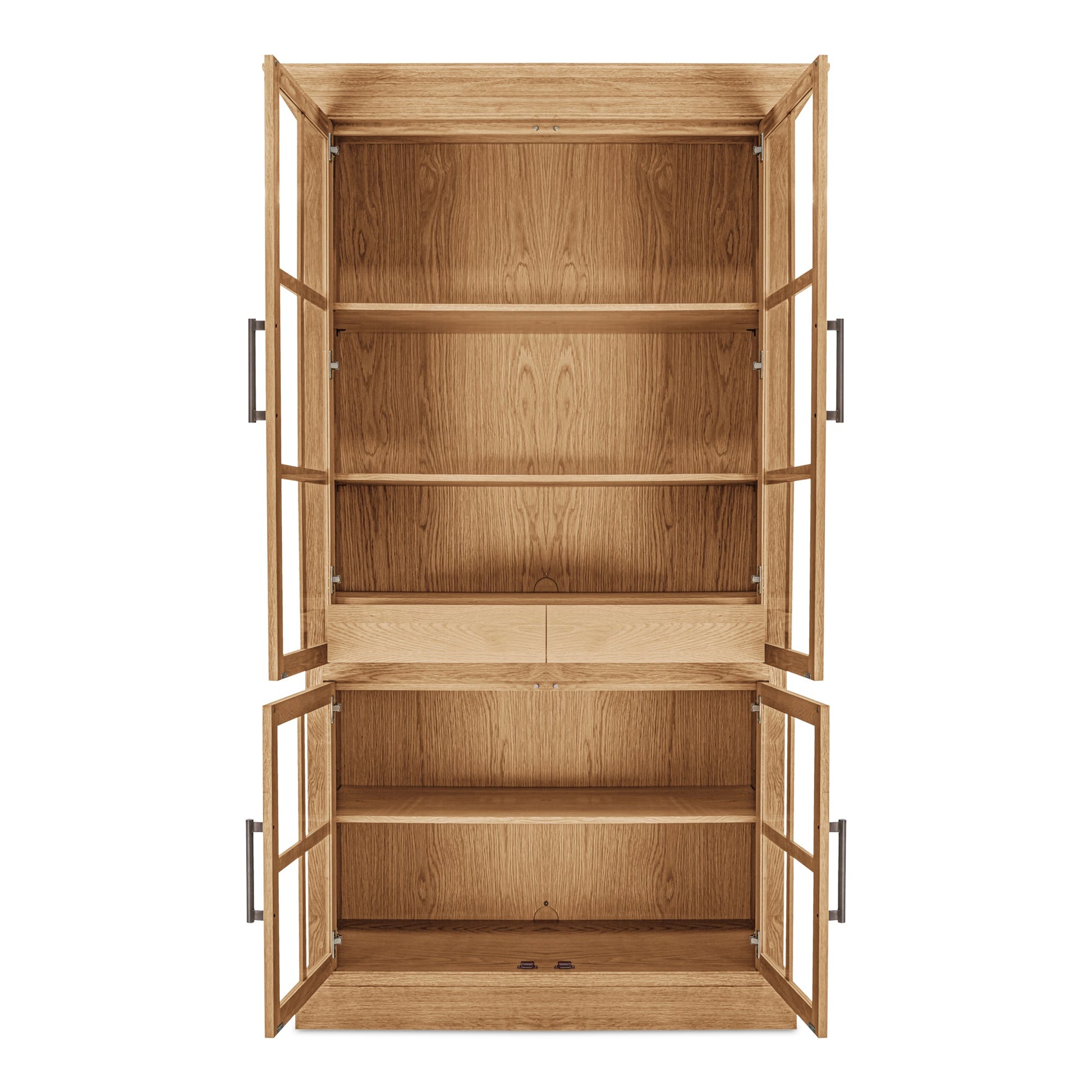 Expertly constructed from solid oak and oak veneer, the Rhonin tall cabinet features a wire-brushed natural finish that imparts warmth and texture. Its glass front, framed with classic molding and a refined overhang, combines timeless elegance with modern design. Inside, two drawers and subtle cable management offer functional storage options.