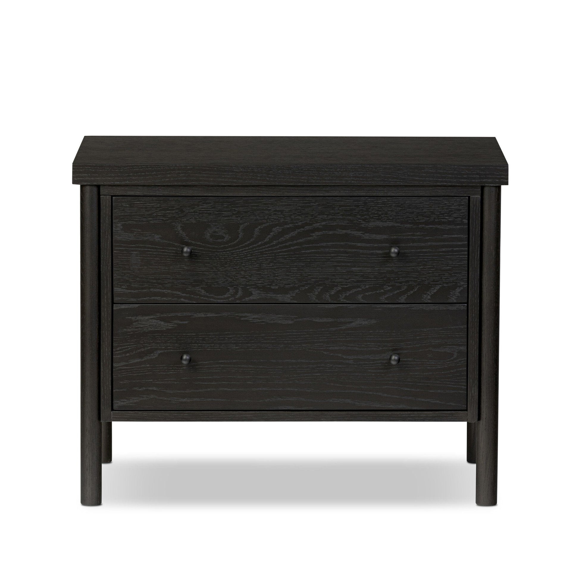 Rounded, chunky dowel legs in a black oak finish support the overhang top of this nightstand. Two drawers provide ample storage, finished with simple gunmetal hardware.