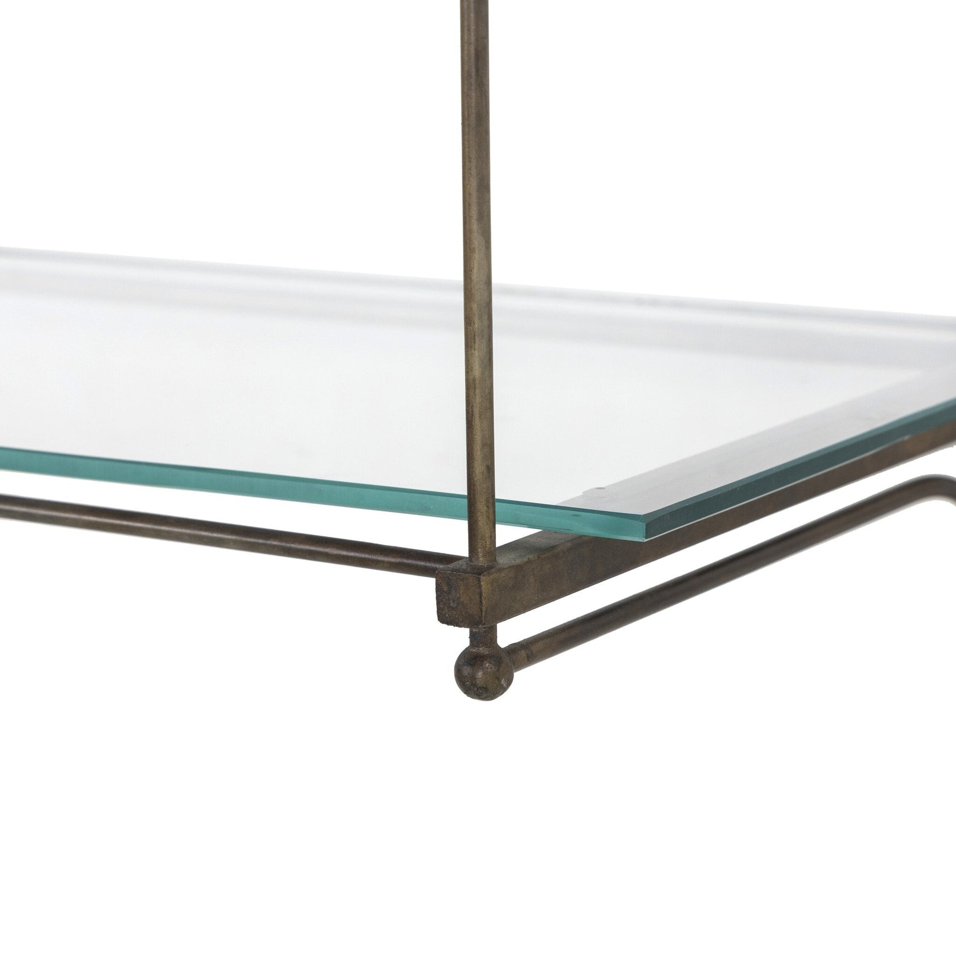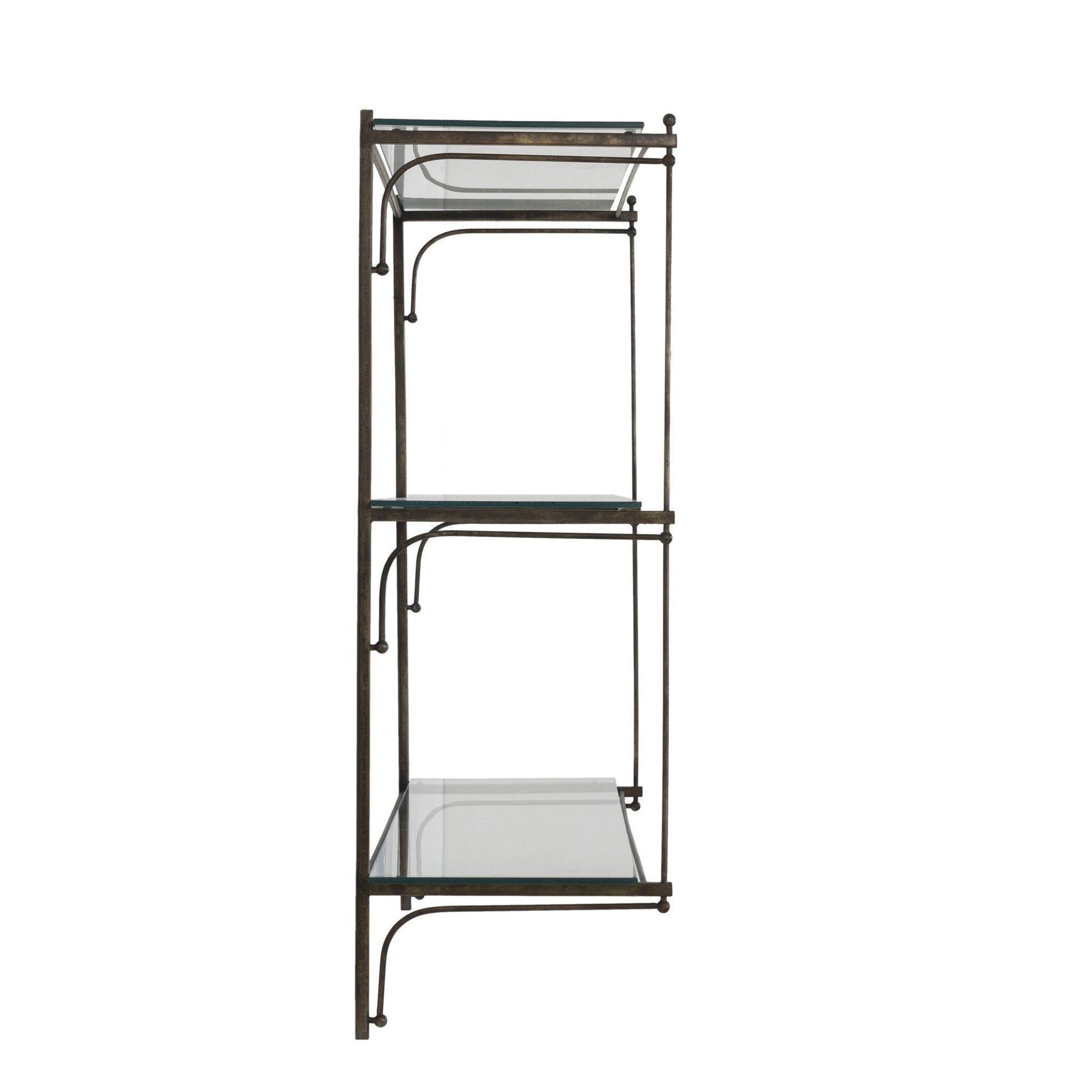 Inspired by vintage ball and rod hardware, this streamlined wall shelf design features delicately curved metal details and simple glass shelves. Finished in a rustic brushed iron with a subtle patina.