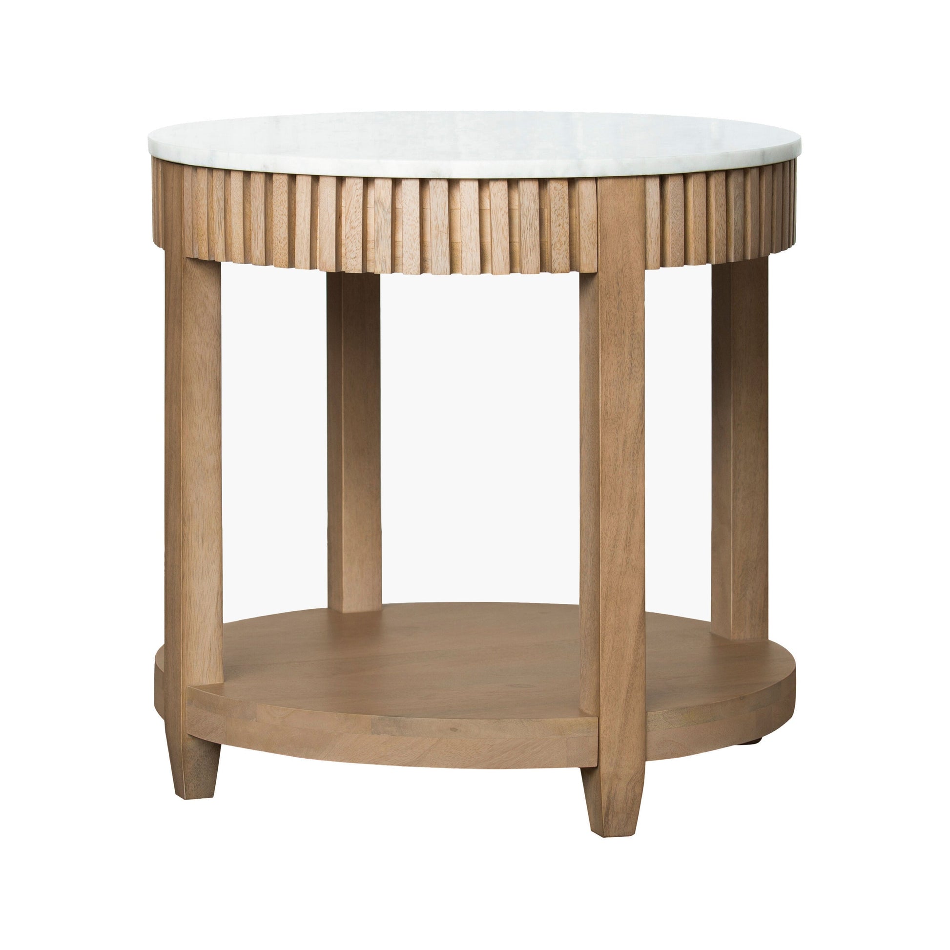 The Rosemary End Table, designed by Becki Owens, beautifully combines white natural marble with white-washed mango wood for elegant storage. Its clear lacquered mango wood base provides sturdy support while highlighting the wood's natural character. Each table features unique marble veining and distinctive wood grain patterns, ensuring your piece is truly one-of-a-kind. A perfect blend of functionality and designer style for your living space.
