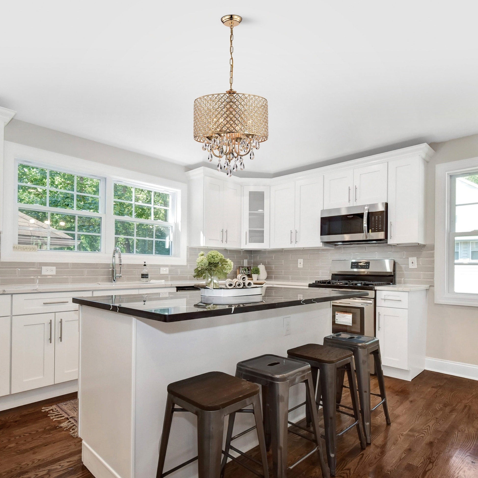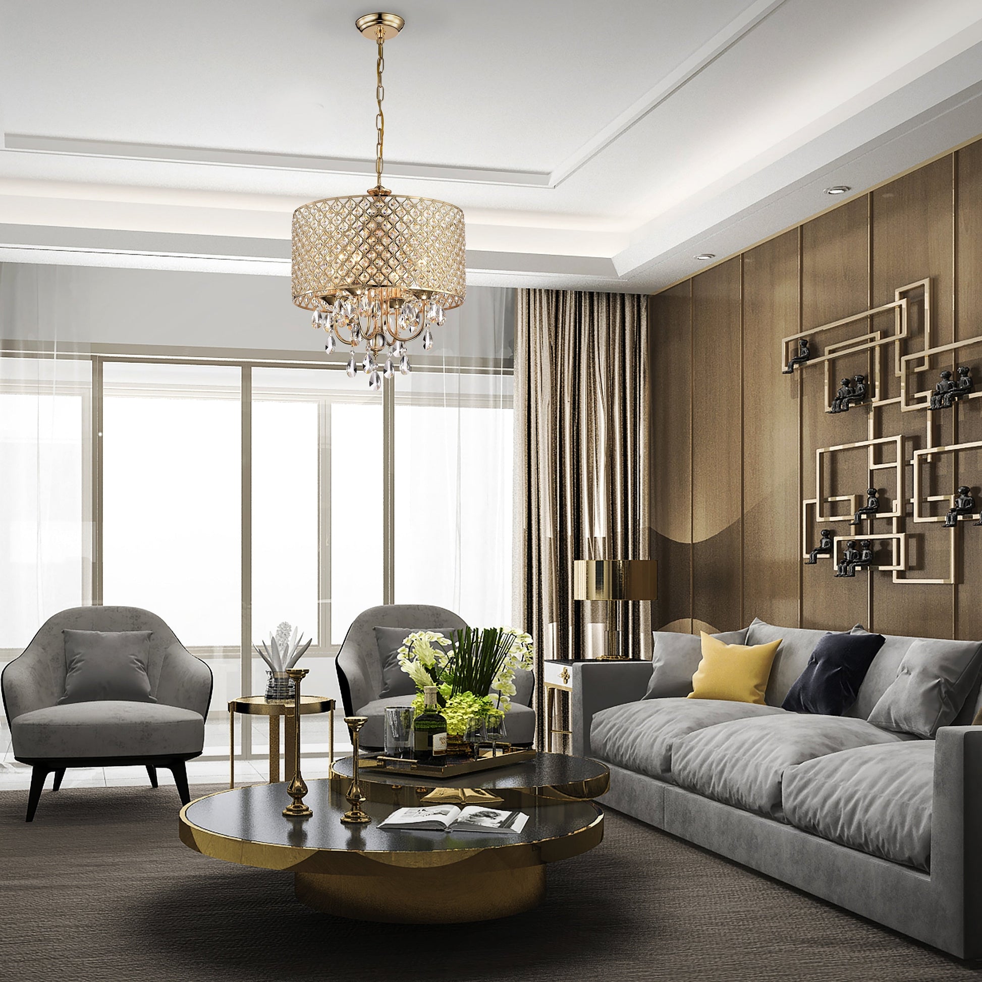 - 4-light chandelier: 17 in. Dia x 20 in. H with crystal hanging, Drum Dimensions: 17 in. Dia x 8.75 in. H