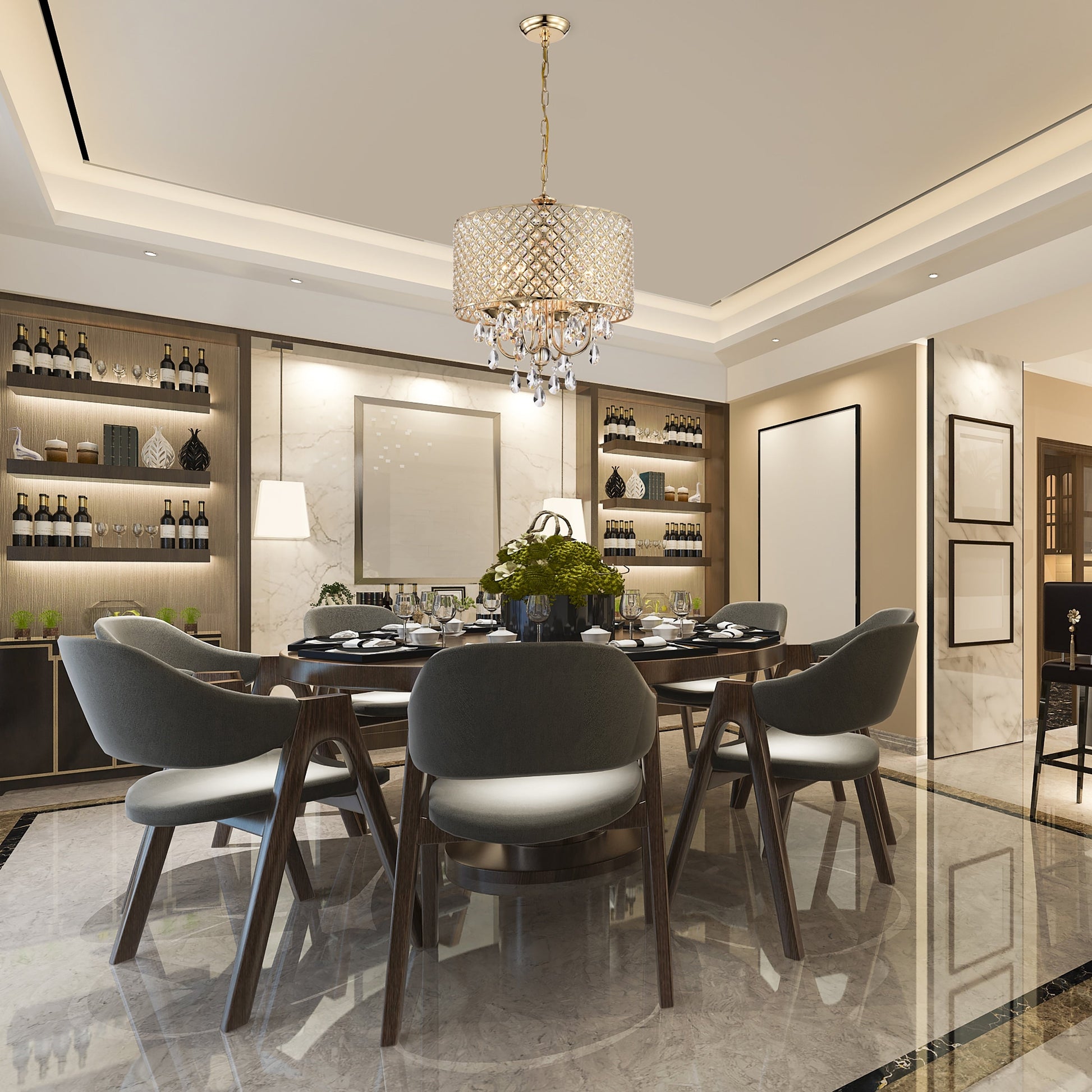 - Crystal encrusted drum shade and cascading crystals for an elegant touch