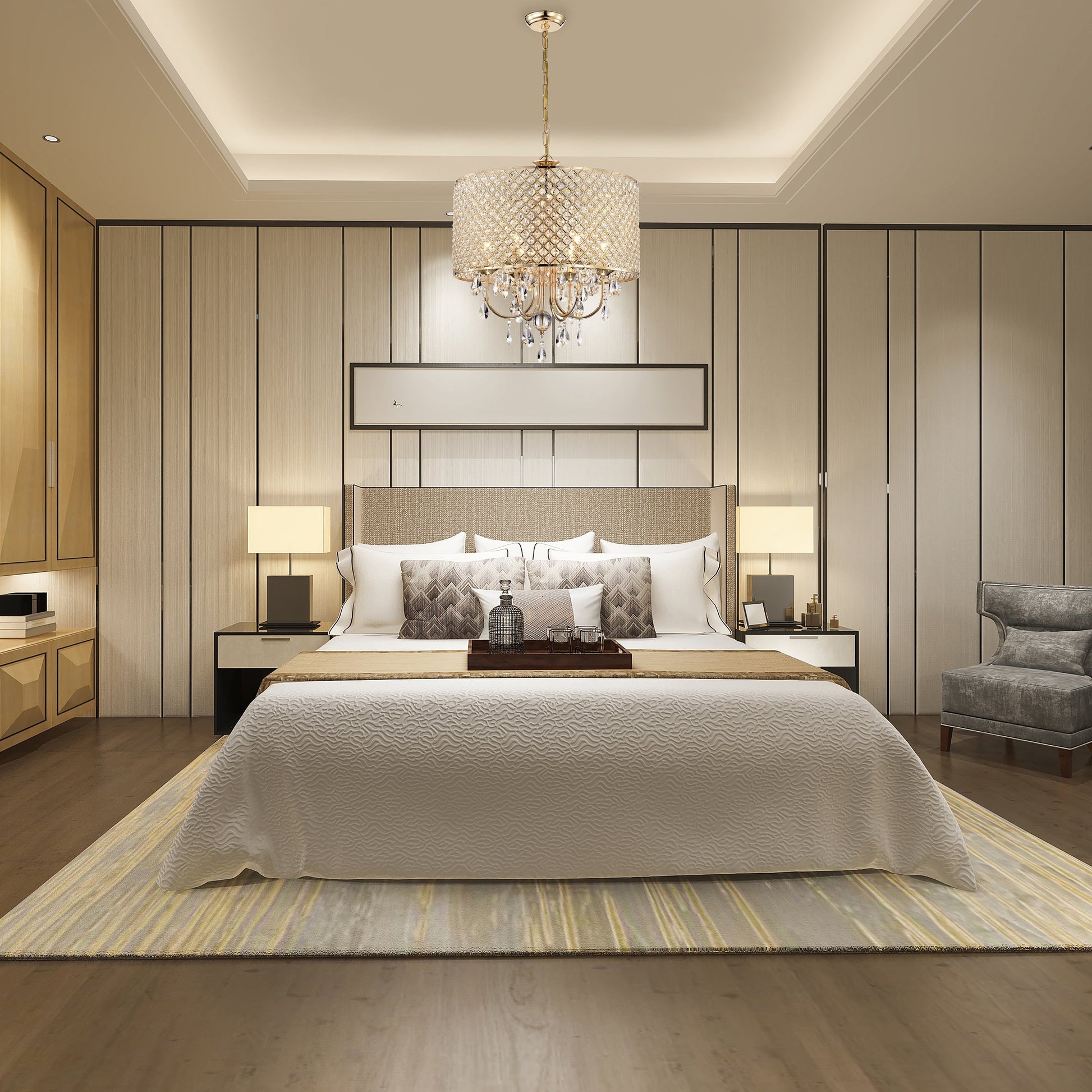 - 6-light chandelier: 22 in. Dia x 24 in. H with crystal hanging, Drum Dimensions: 22 in. Dia x 11 in. H
