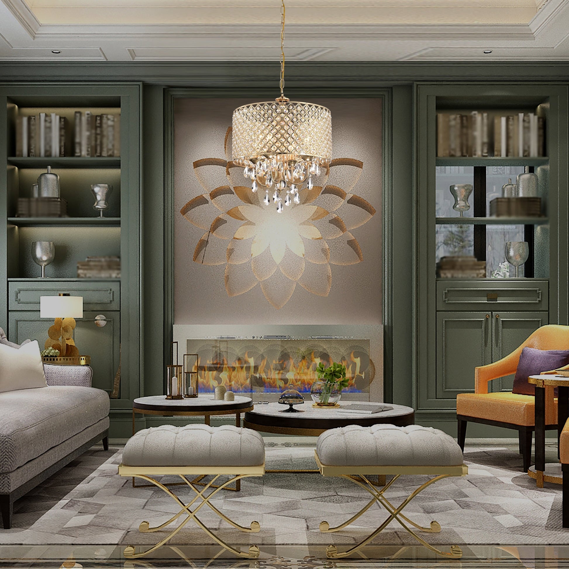 Round Beaded Drum Chandelier with Hanging Crystals