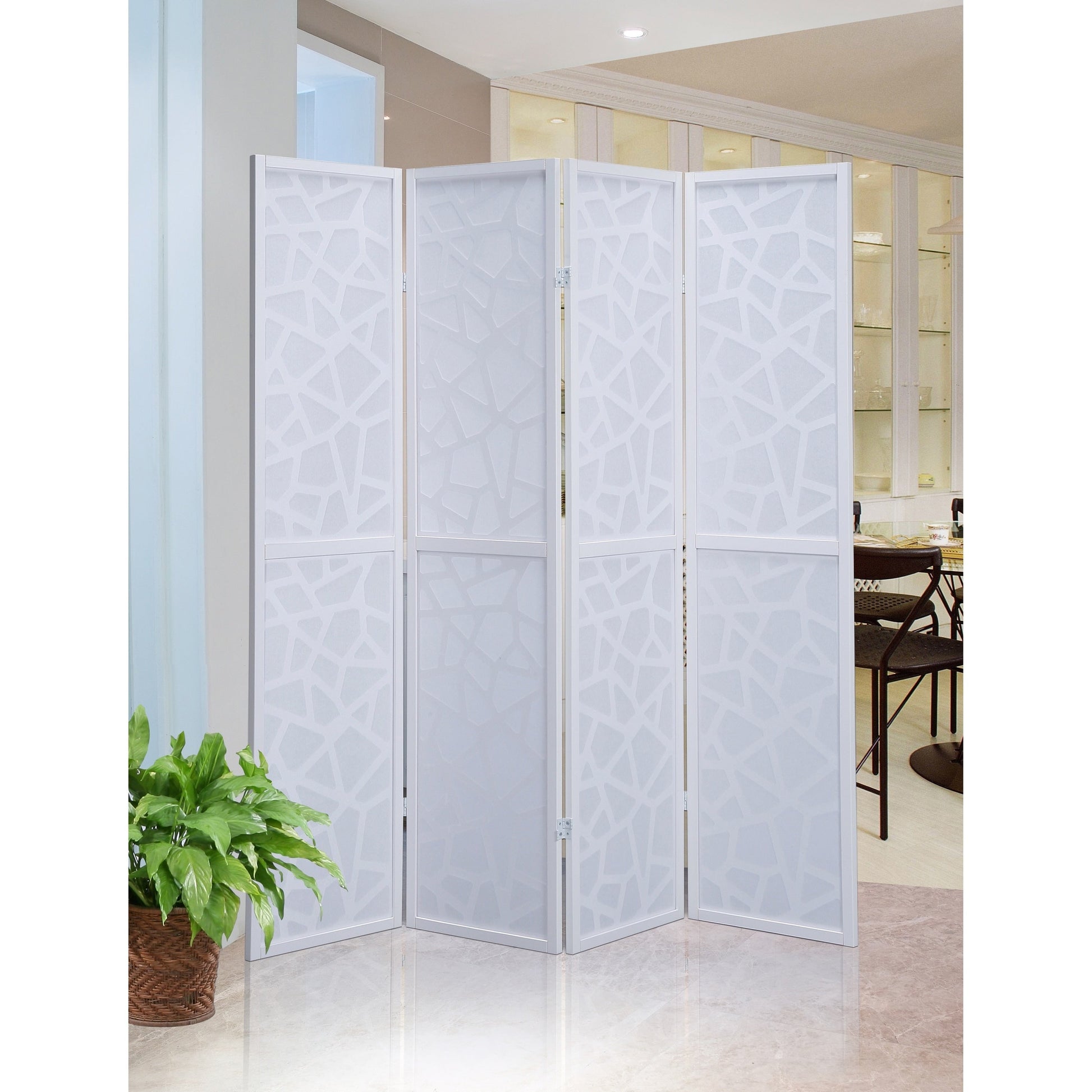 Add a touch of elegance to your living space with the Giyano 4-panel screen room divider. The black and white mosaic pattern on this room divider is sure to impress. Made of engineered woods and fabric, this divider comes fully assembled and can be easily folded for space-saving storage.