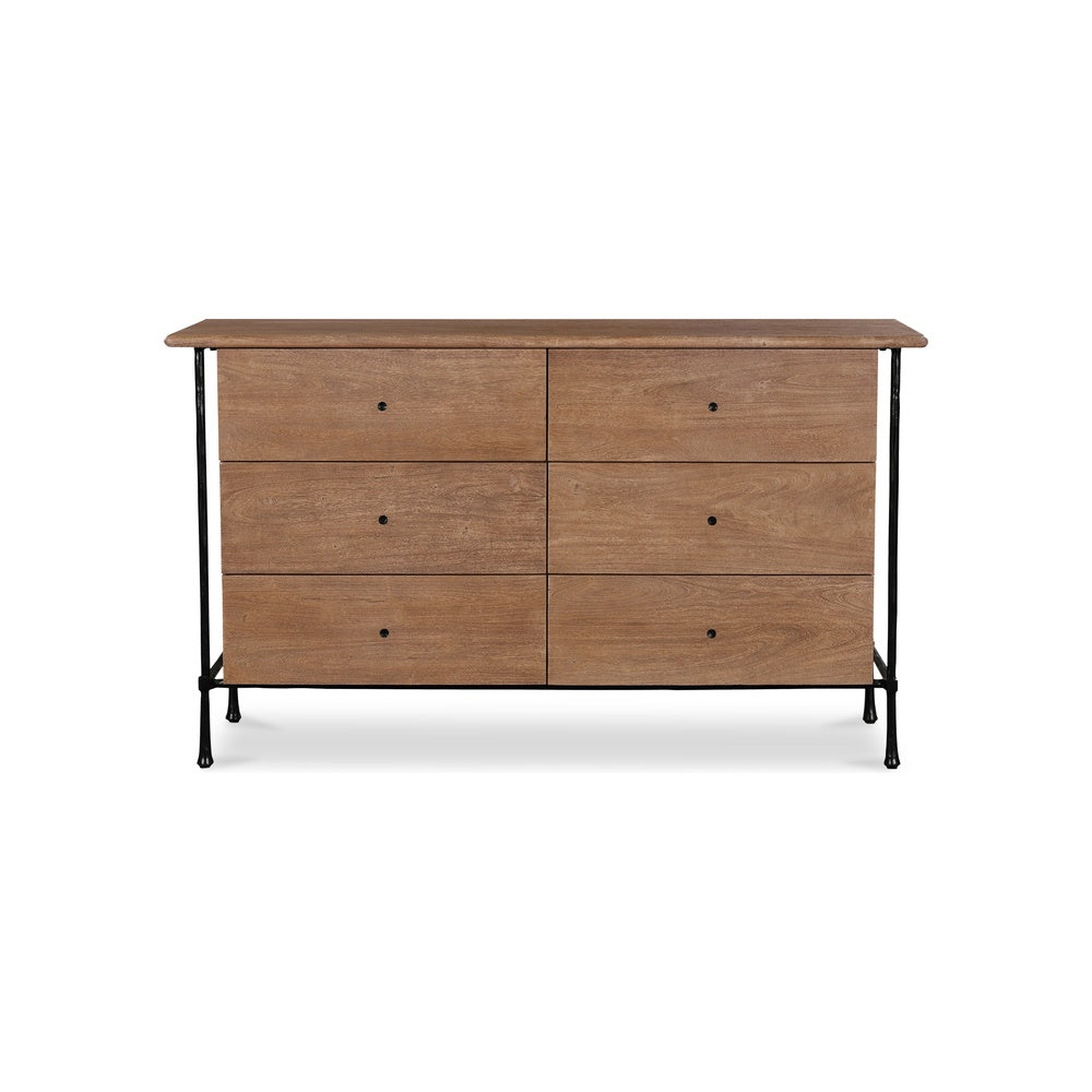 The Ryne 6-drawer dresser seamlessly combines classic style with modern sophistication, featuring beveled feet and a blend of materials. Made from solid Acacia wood, its wire-brushed finish highlights detailed grain textures, while hammered iron legs provide a distinctive floating appearance. Expertly crafted with precise wood joinery and contrasting iron handles, the dresser offers six roomy drawers for generous storage.