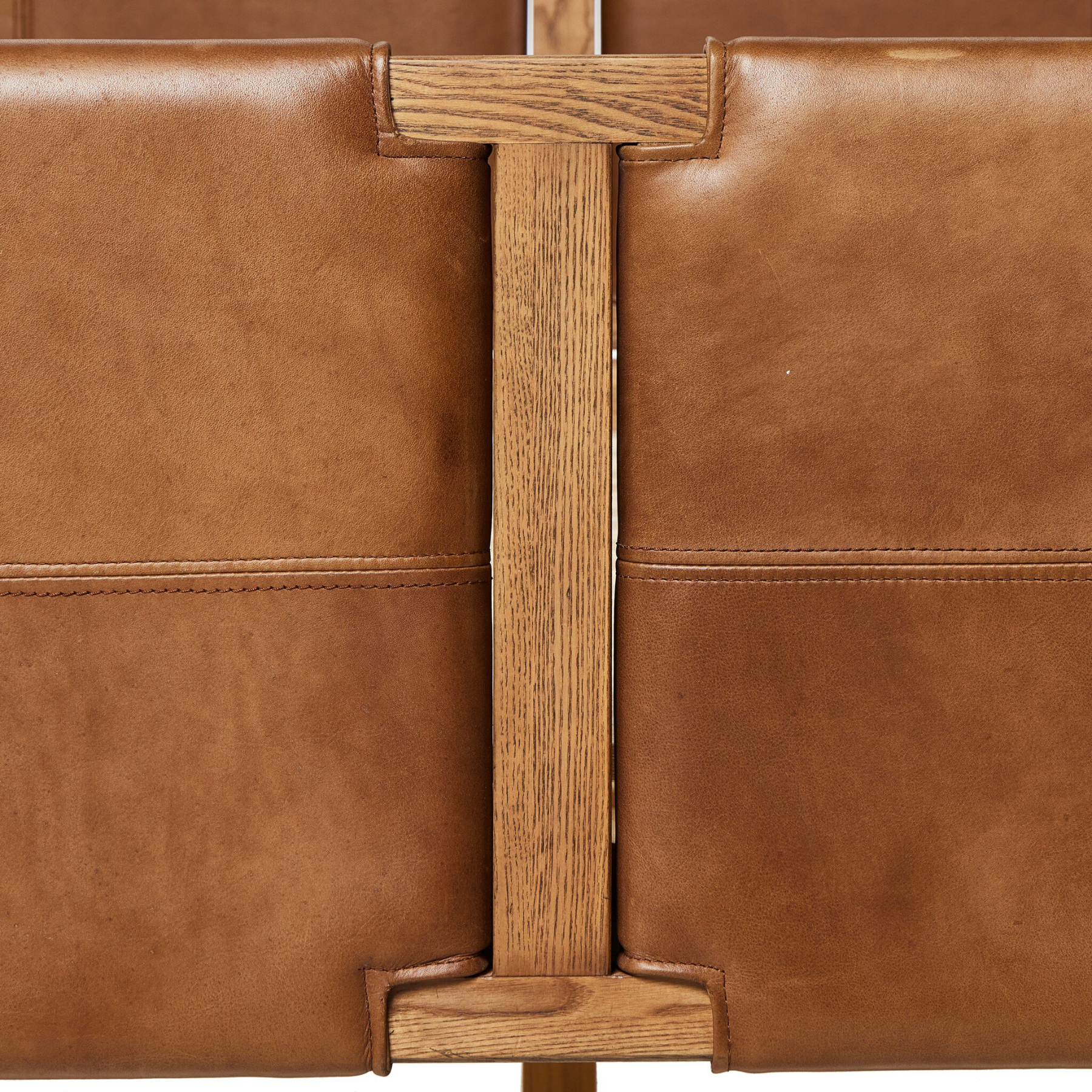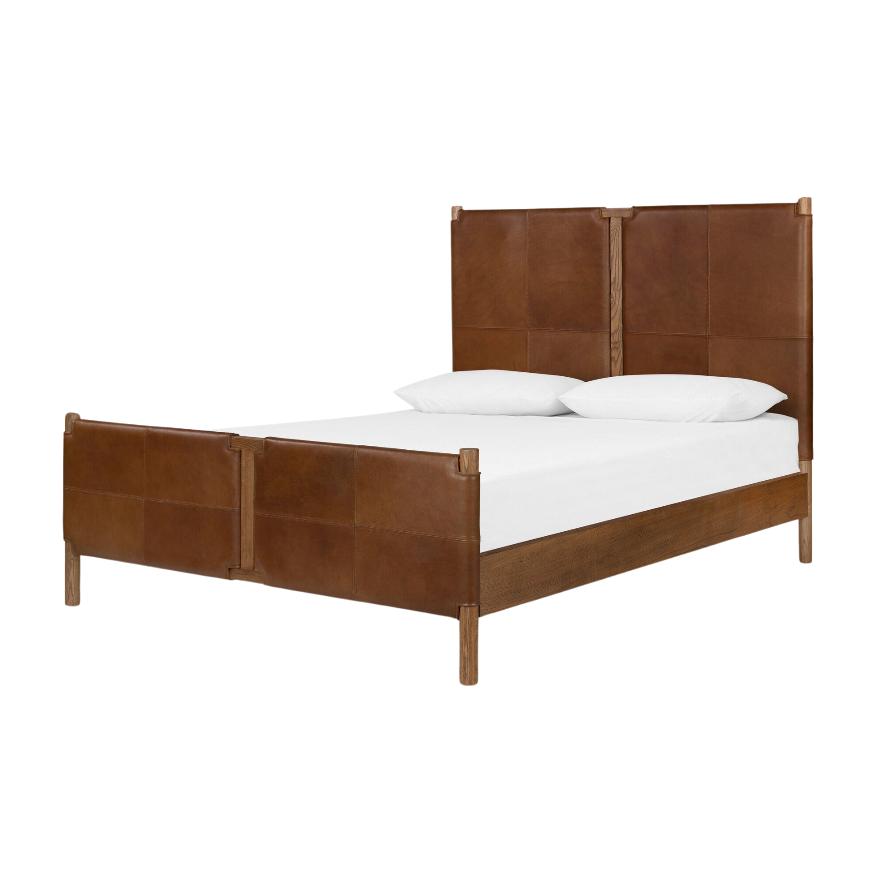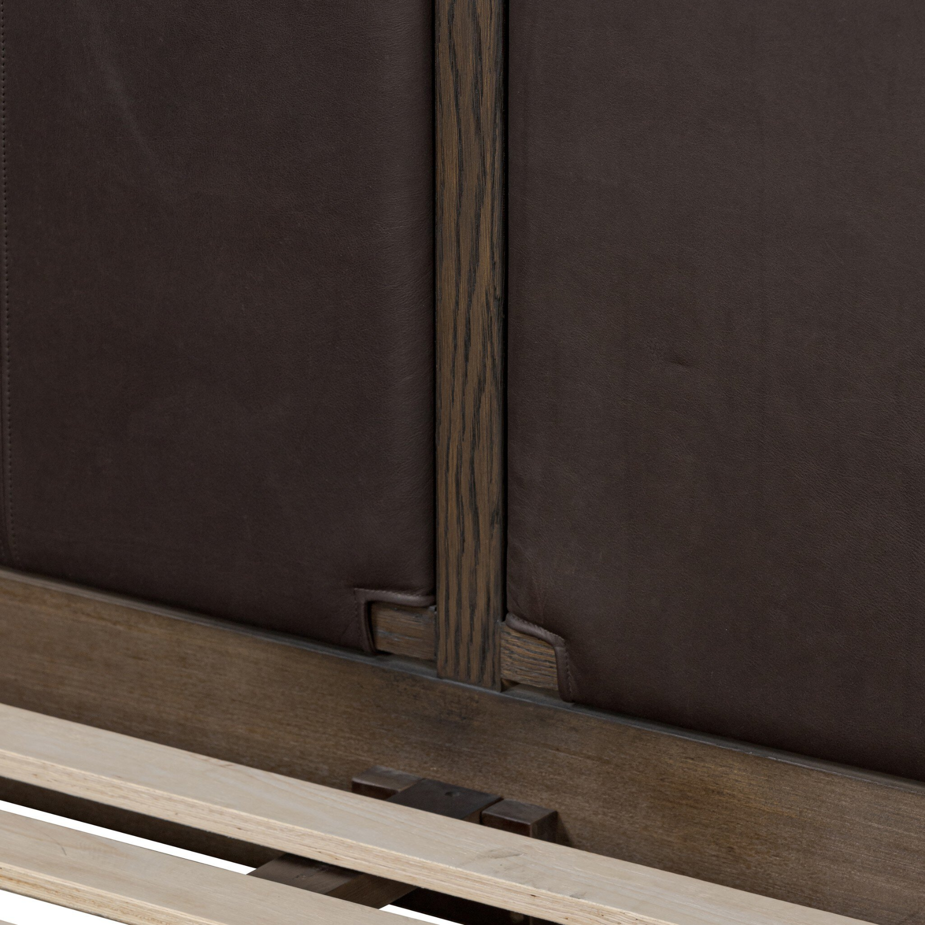 Introducing the Santoro Bed - crafted with oak framing and heirloom leather panel details. Sourced from Italy's oldest family-owned tanneries, our deep brown leather boasts natural markings, scars, and color variations. Soft, buttery, and with an authentic lived-in look, this bed adds luxury and sophistication to any bedroom.
