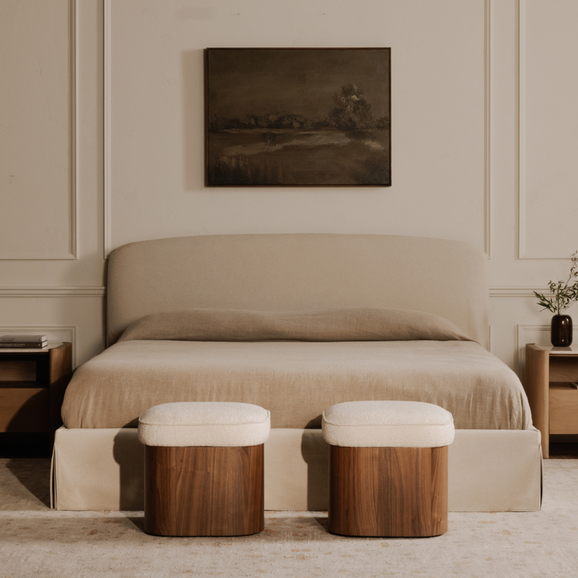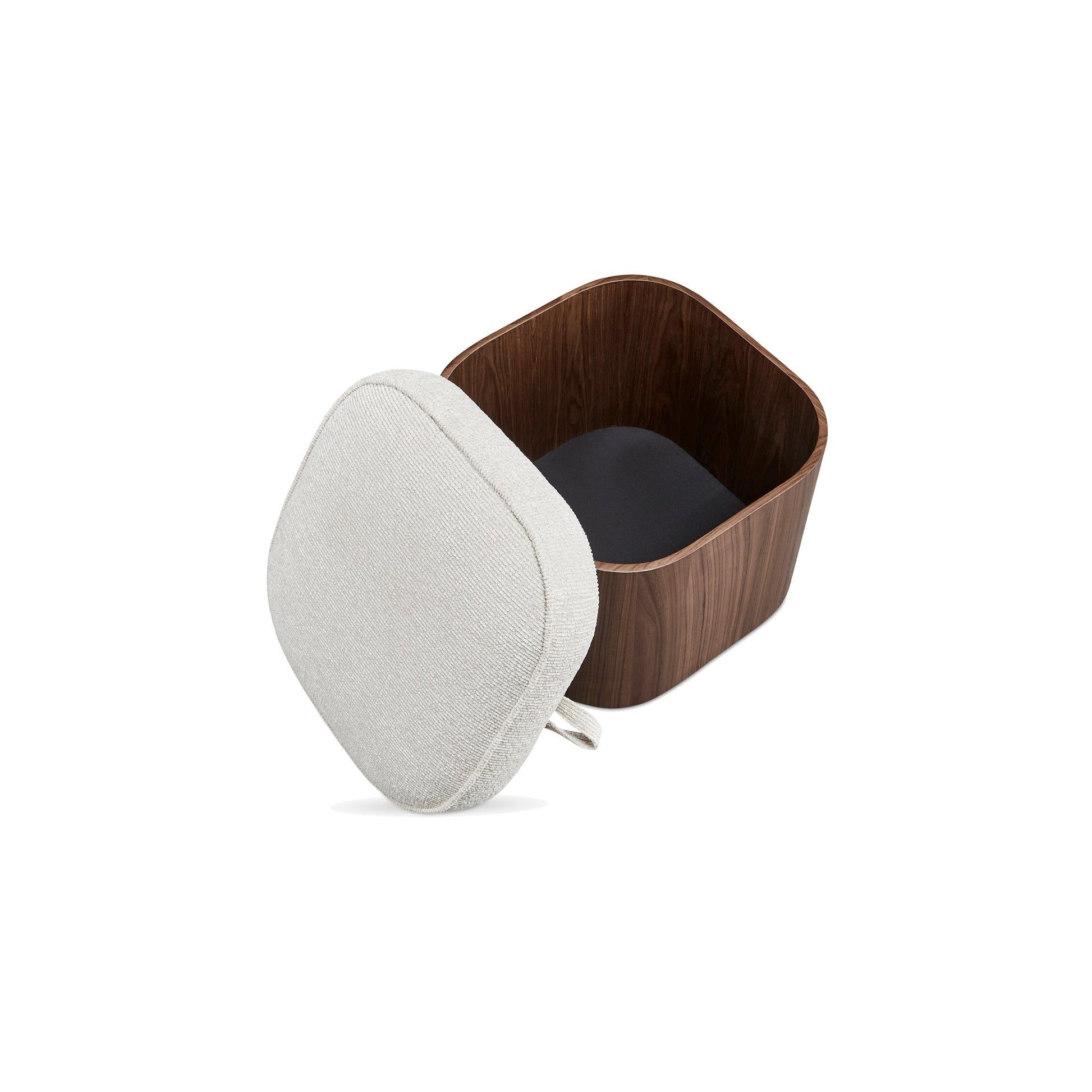 The Saxon Stool combines stylish simplicity and practical functionality. Its plush seat is upholstered in flecked oatmeal fabric and contrasts beautifully with the solid walnut veneer base. Lift the top to reveal discreet storage for added convenience. Its curved corners create a serene silhouette, making it a perfect addition to any space.