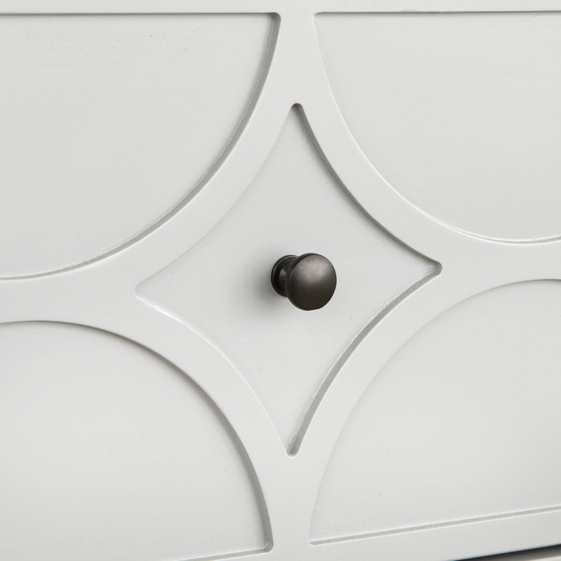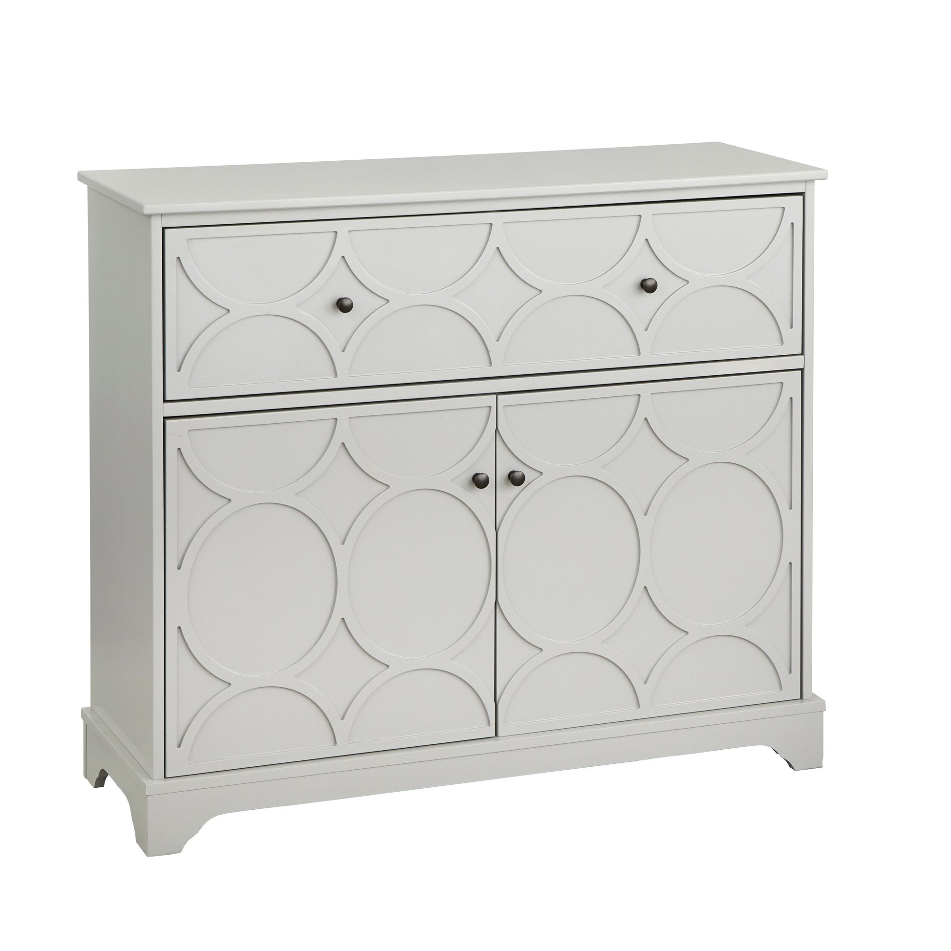 Declutter your dining space with the Simple Living Dawson Circle Front Cabinet. The cabinet comes in four options of charcoal grey, white, green lily or midnight blue finish with circular patterns on the front panels for an aesthetic look. It features a top drawer and roomy lower compartment with an adjustable shelf to help you organize your dining essentials with ease. Crafted with MDF, this cabinet also features black finished knobs for easy access.