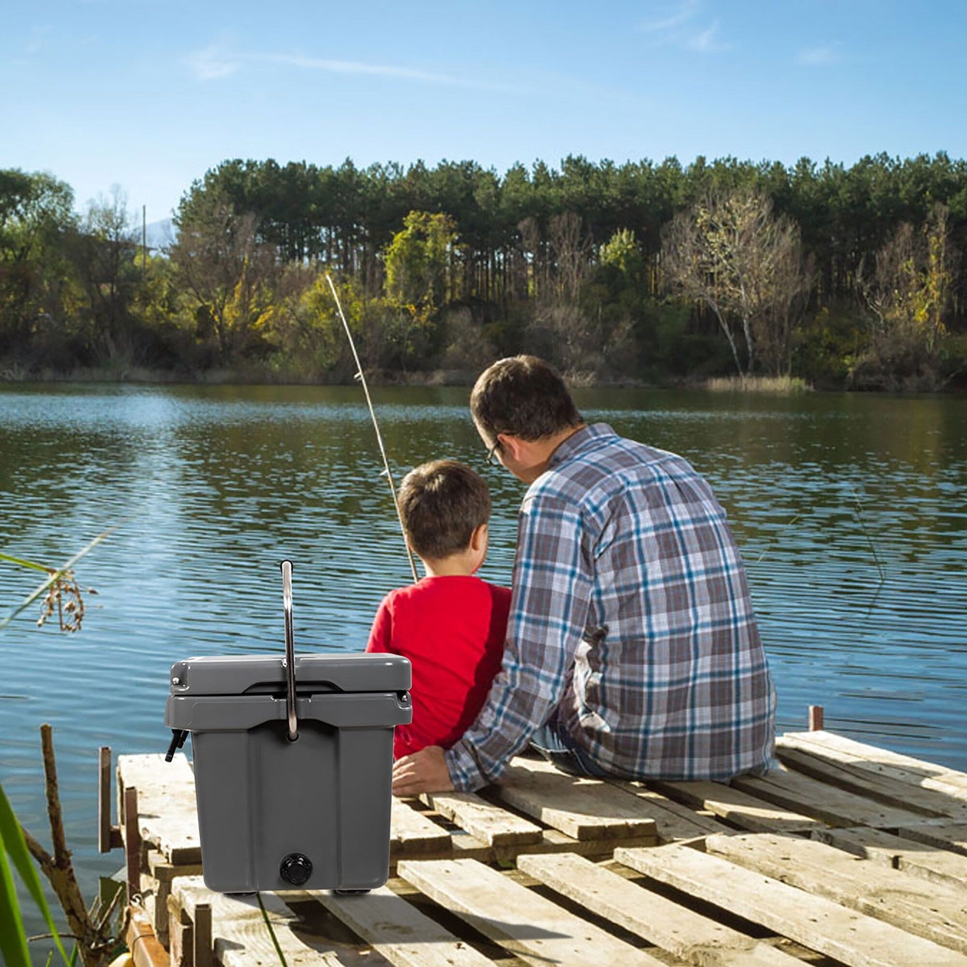This cooler with perfect performance and indestructible rotomolded construction is undoubtedly your good partner for outdoor activities. Made of premium PE and PU insulating materials, this 16-quart cooler is non-toxic and can keep food beverages and fruit cold for 3-5 days. Featuring portable design, this ice chest can be applied in various situations, such as BBQ parties, picnic, fishing, camping or self-drive travelling. And it can also be used to keep food warm. This cooler is equipped with 2 cup holders, securing latches, lockable lid, stainless steel handle, drain plug and foot pads. All of these thoughtful details make it a perfect cooler.