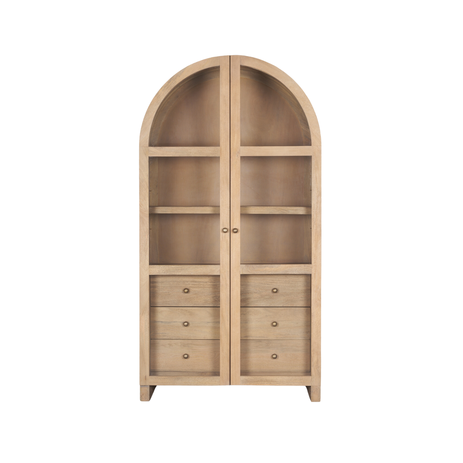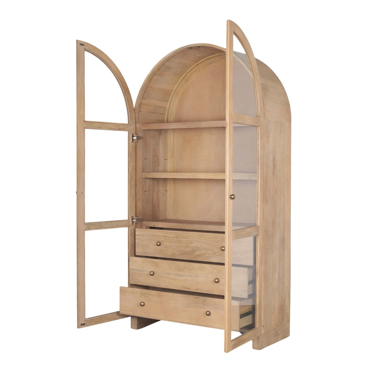 Indulge in luxury with the Sosie Cabinet. Made of solid light brown mango wood, this premium curio cabinet boasts handmade solid brass knobs and a sandblasted textured finish. With two customizable shelves and three spacious drawers, store your treasures in style. Its elegant arched design and soothing neutral hues make it a sophisticated addition to any space.