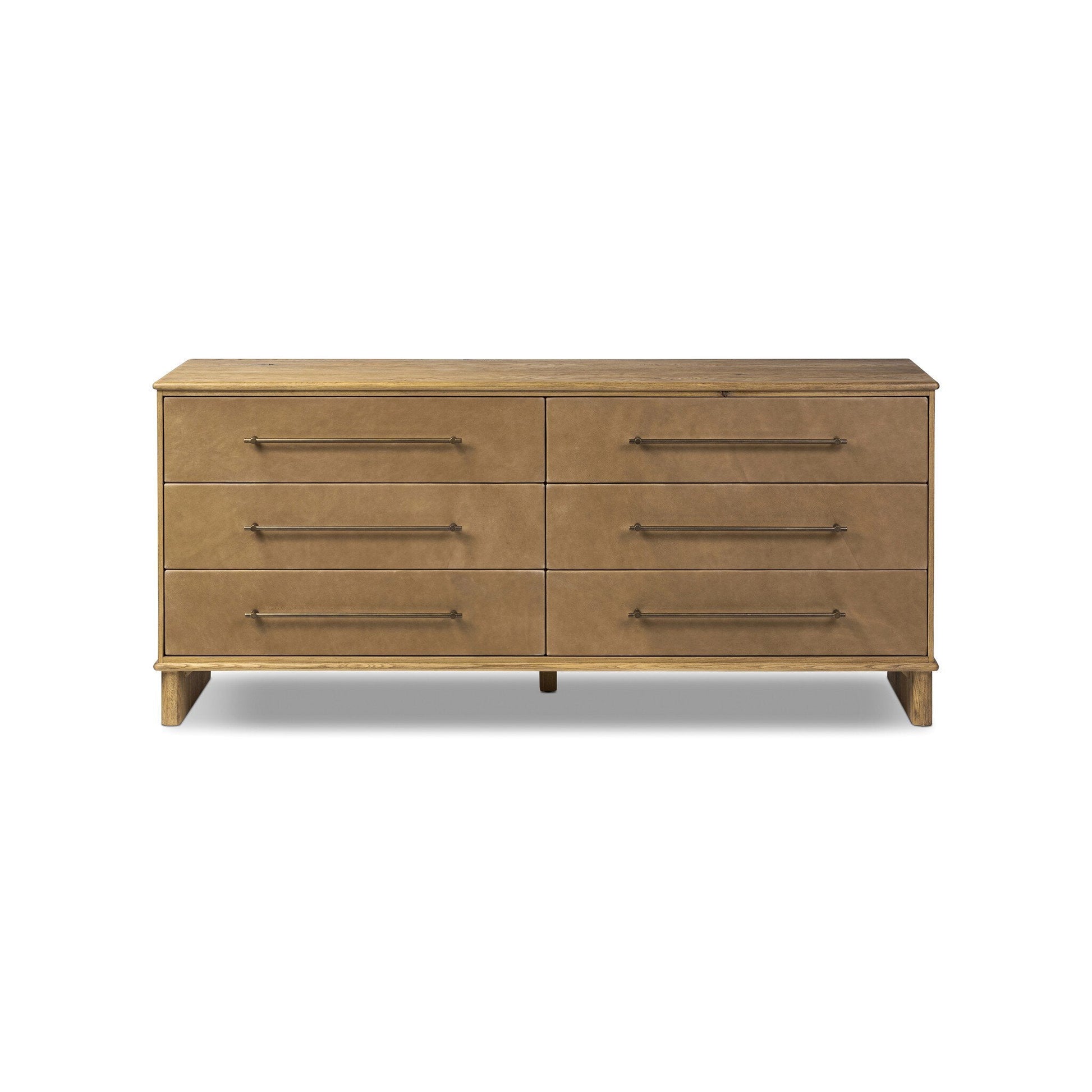 Bring a Nordic, material-driven look to your bedroom with a six-drawer dresser of grain-rich oak and drawer fronts covered with tan top-grain leather. Finished out with long, linear iron hardware.