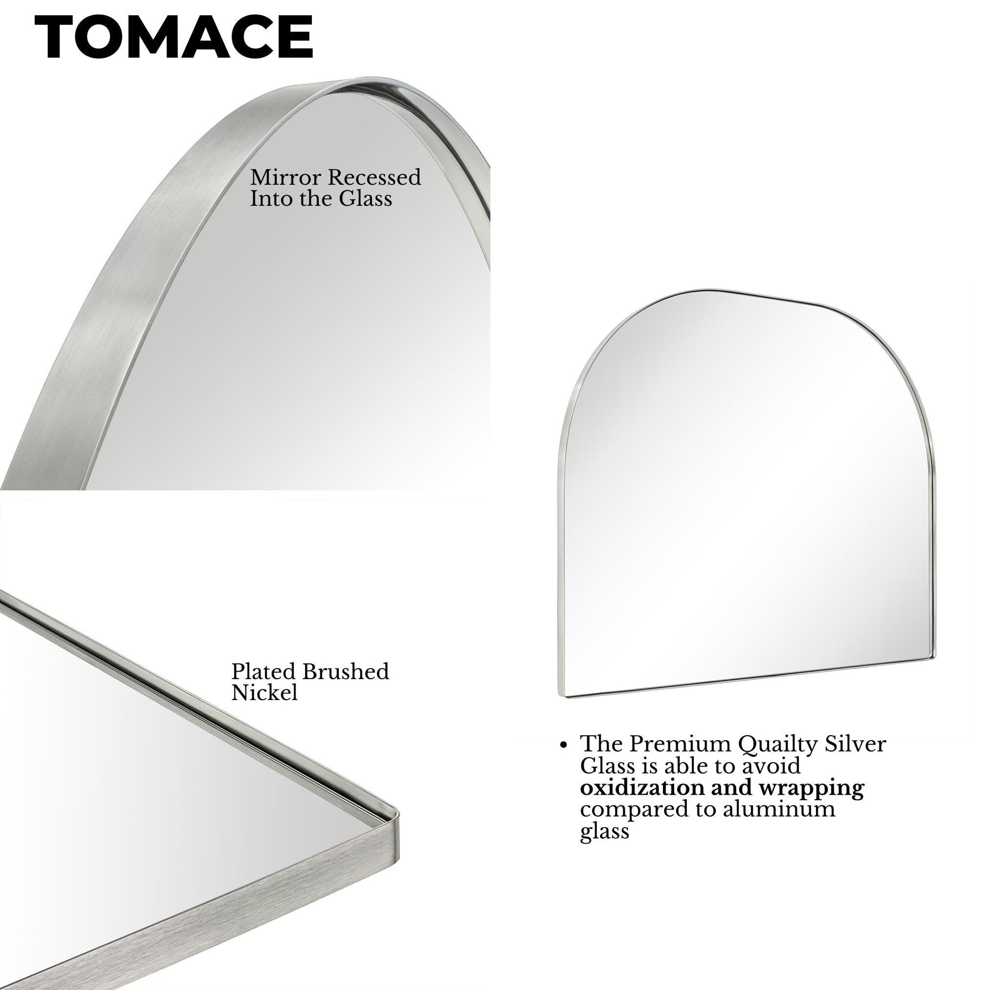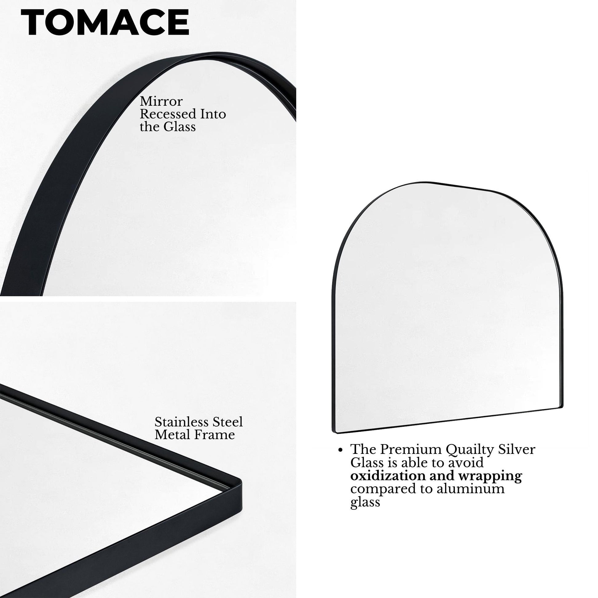 - Seamless Stainless Steel Frame: This arched bathroom mirror uses preminum quality stainless steel material and 9mm TSCA certified MDF backing to avoid both rust and corrosion when wall mounted, making it safe for bathroom use as well.