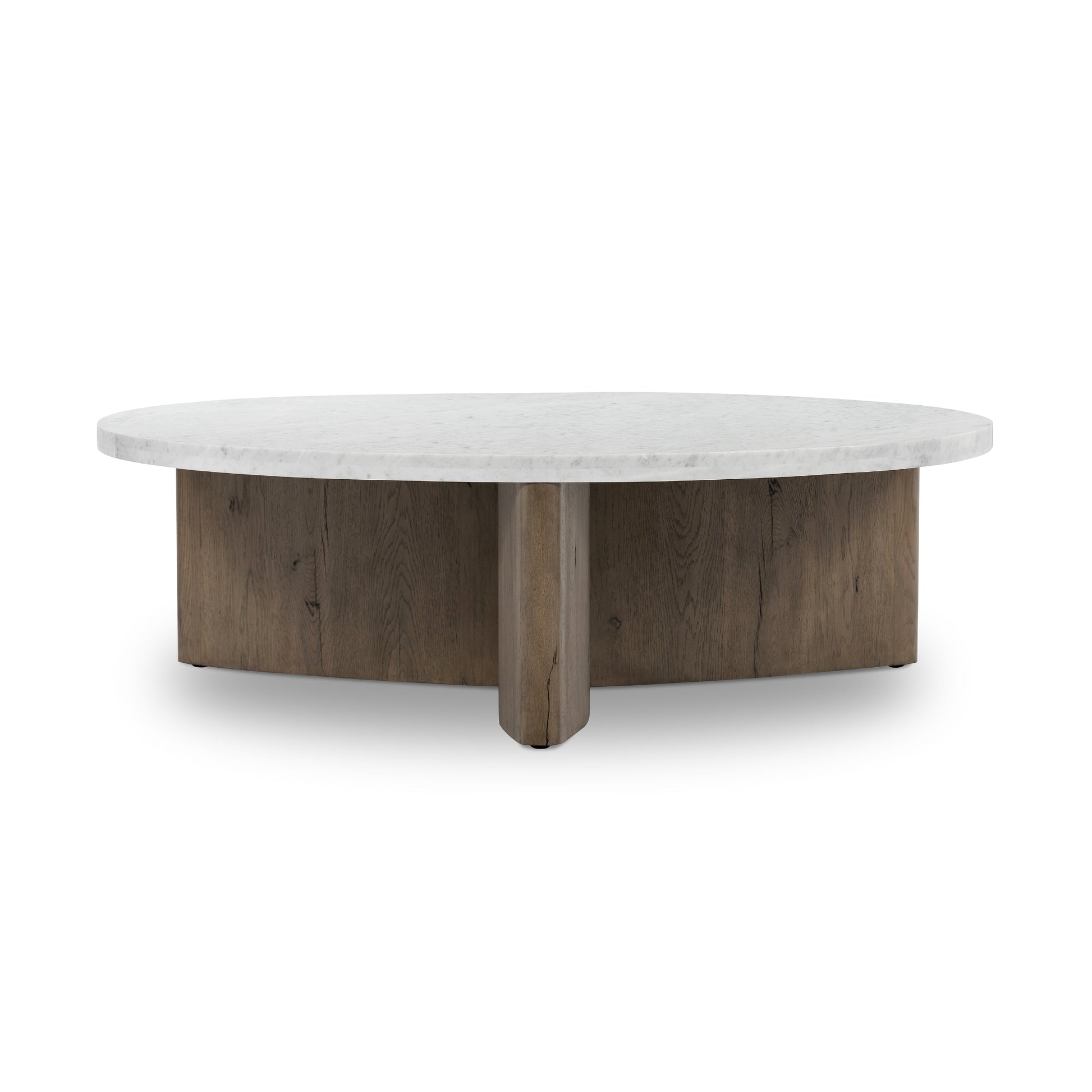 Mixed materials make the table. Finished in a rustic grey, thick-cut oak forms a chunky pedestal base for a rounded tabletop of white Italian marble, with beautifully subtle natural veining.