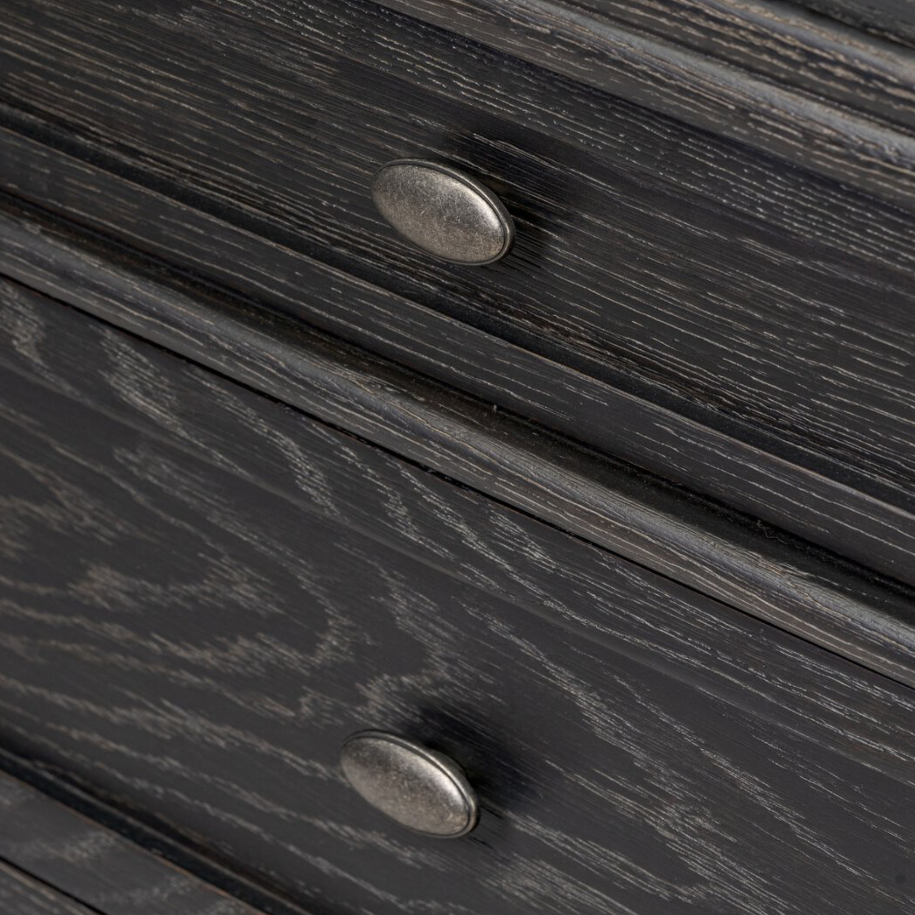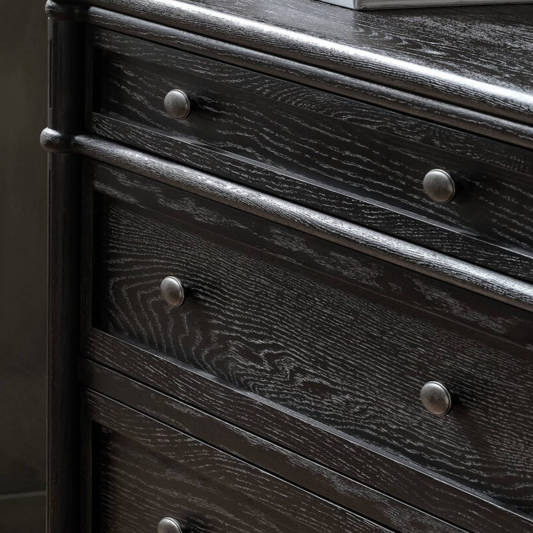The Toulouse Dresser features oak veneer construction with slim, solid oak legs finished in distressed black, blending antique European character with modern bedroom aesthetics. Its varied drawer sizes provide practical storage while enhancing the piece’s sophisticated, timeless appeal.