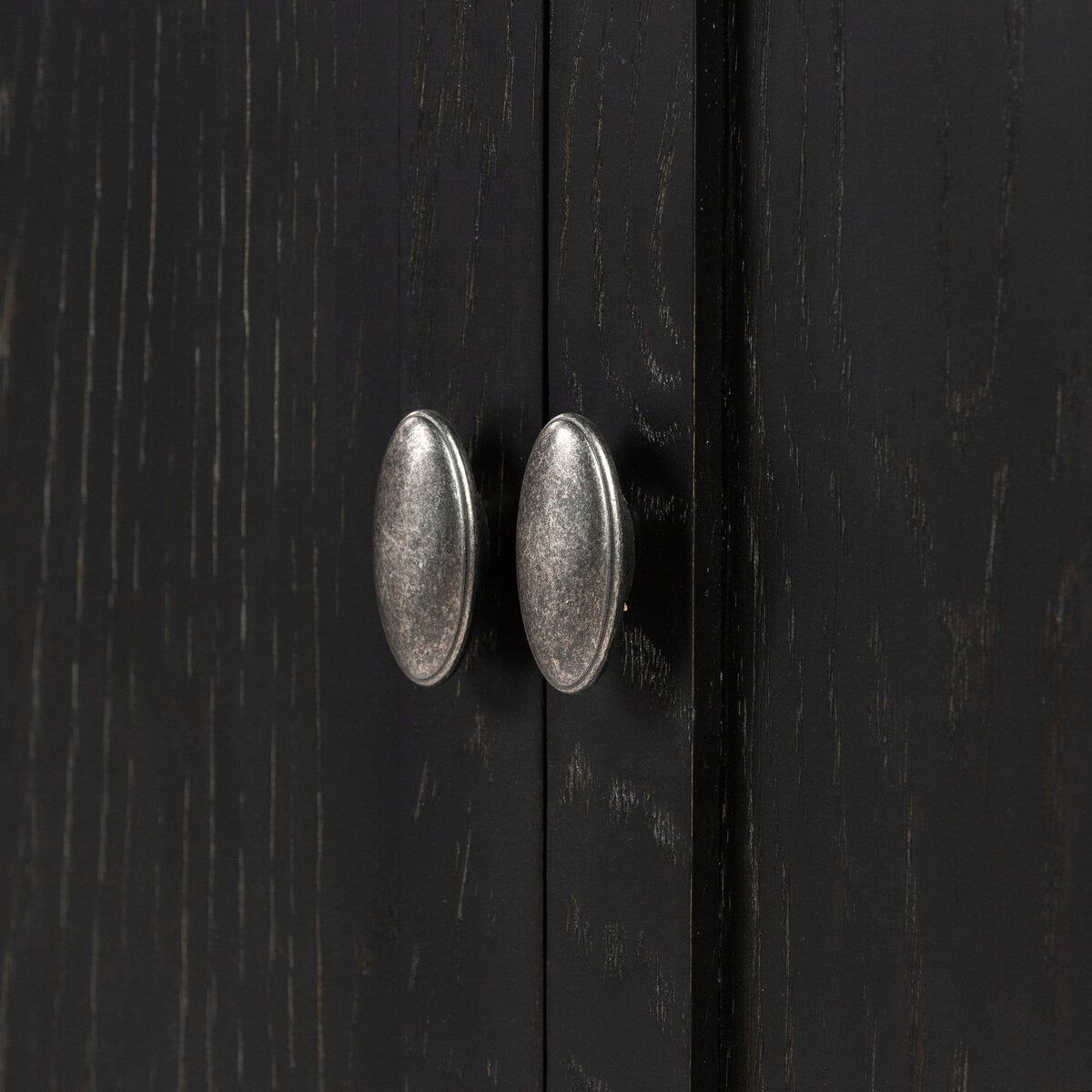 The Toulouse Sideboard showcases vintage European design with framed panels, rounded corners, and tapered spindle legs. Crafted from solid oak and oak veneer in a distressed black finish, it offers both durability and timeless style. Its spacious interior provides ample storage, while rear cutouts ensure efficient cord management, making it ideal for organizing media devices or other electronics seamlessly.