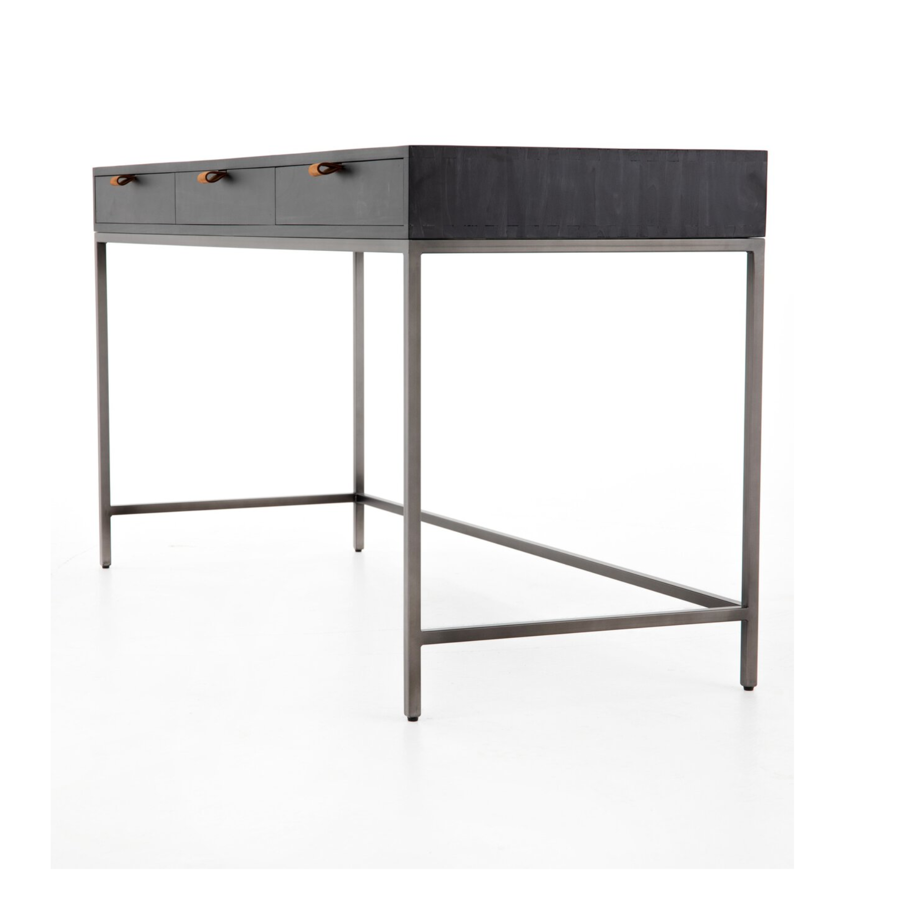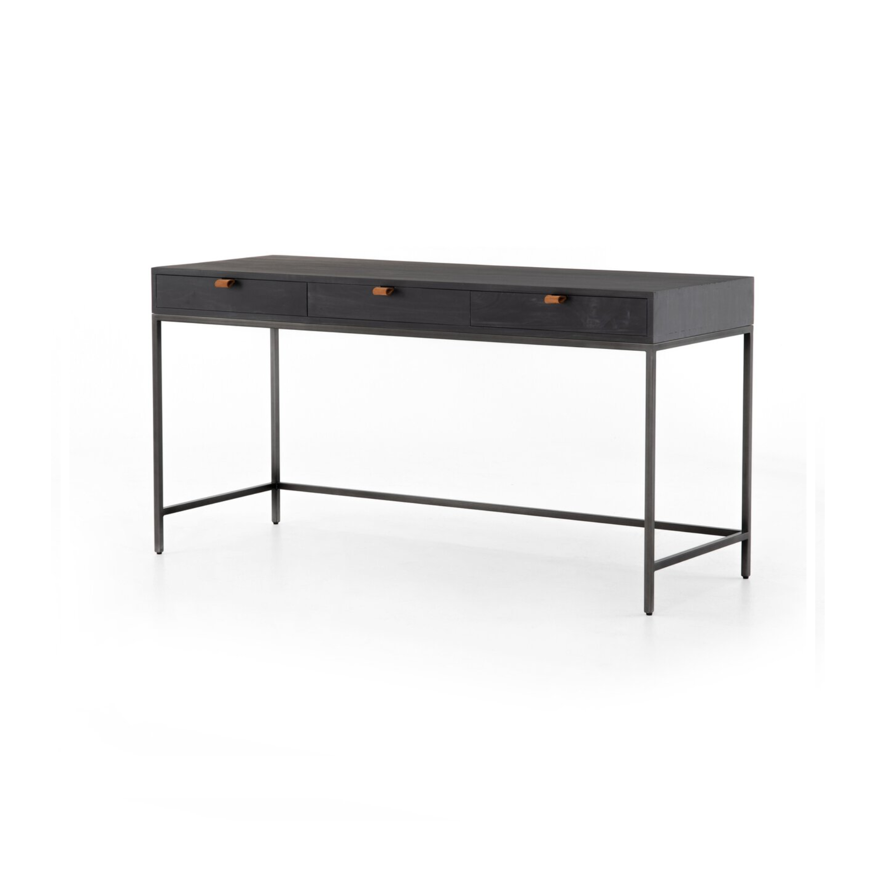 The Trey Console Table showcases mid-century modern elegance with its black-finished poplar construction. Designed for functionality, it features three spacious drawers that provide ample storage, complemented by metal-secured leather pulls that add a refined touch. Its fully finished back allows versatile placement, making it ideal as a standalone piece or paired seamlessly with matching corner desks, file cabinets, or credenzas for a cohesive workspace.