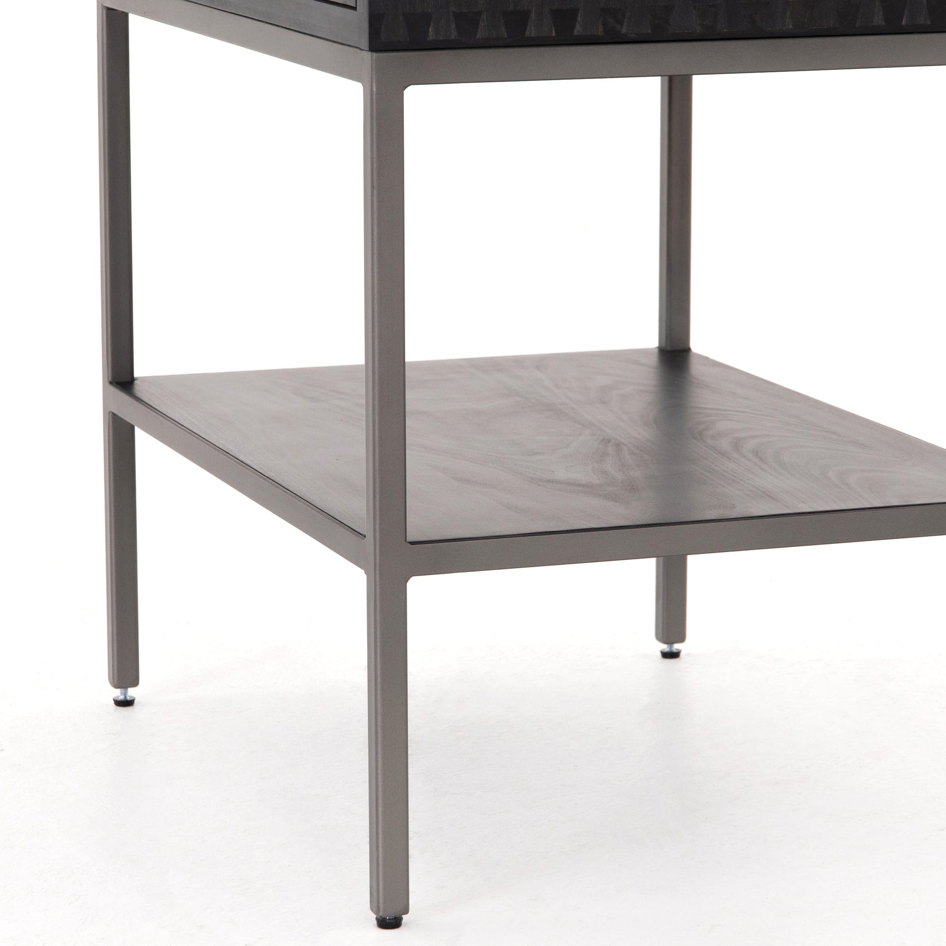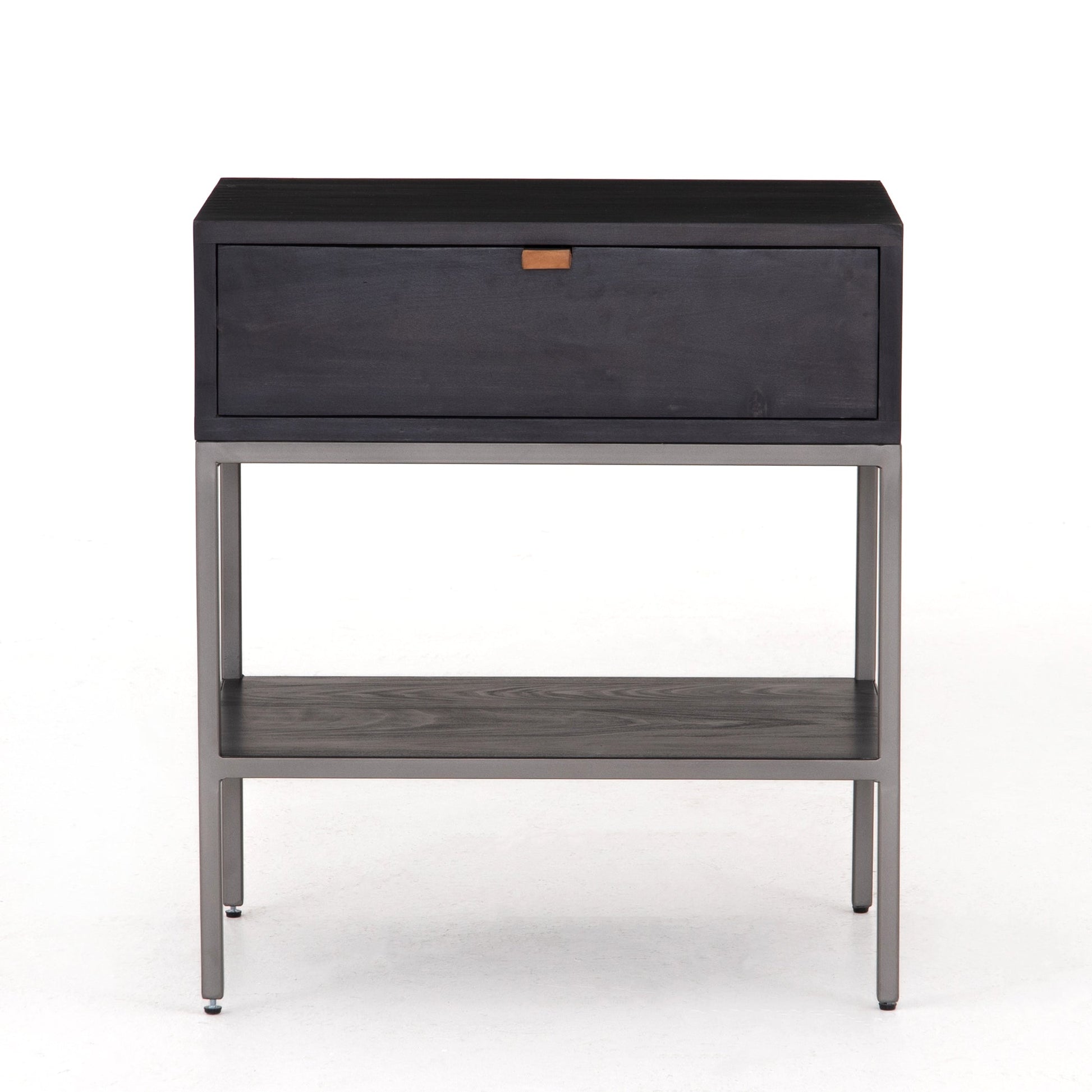 The Trey Nightstand combines mid-century modern aesthetics with practical design. Crafted from solid black-washed poplar, it offers durable bedside storage with a refined look. The metal-secured leather pull introduces a subtle textural contrast, enhancing both functionality and style. Ideal for those seeking a sophisticated yet understated addition to their bedroom.
