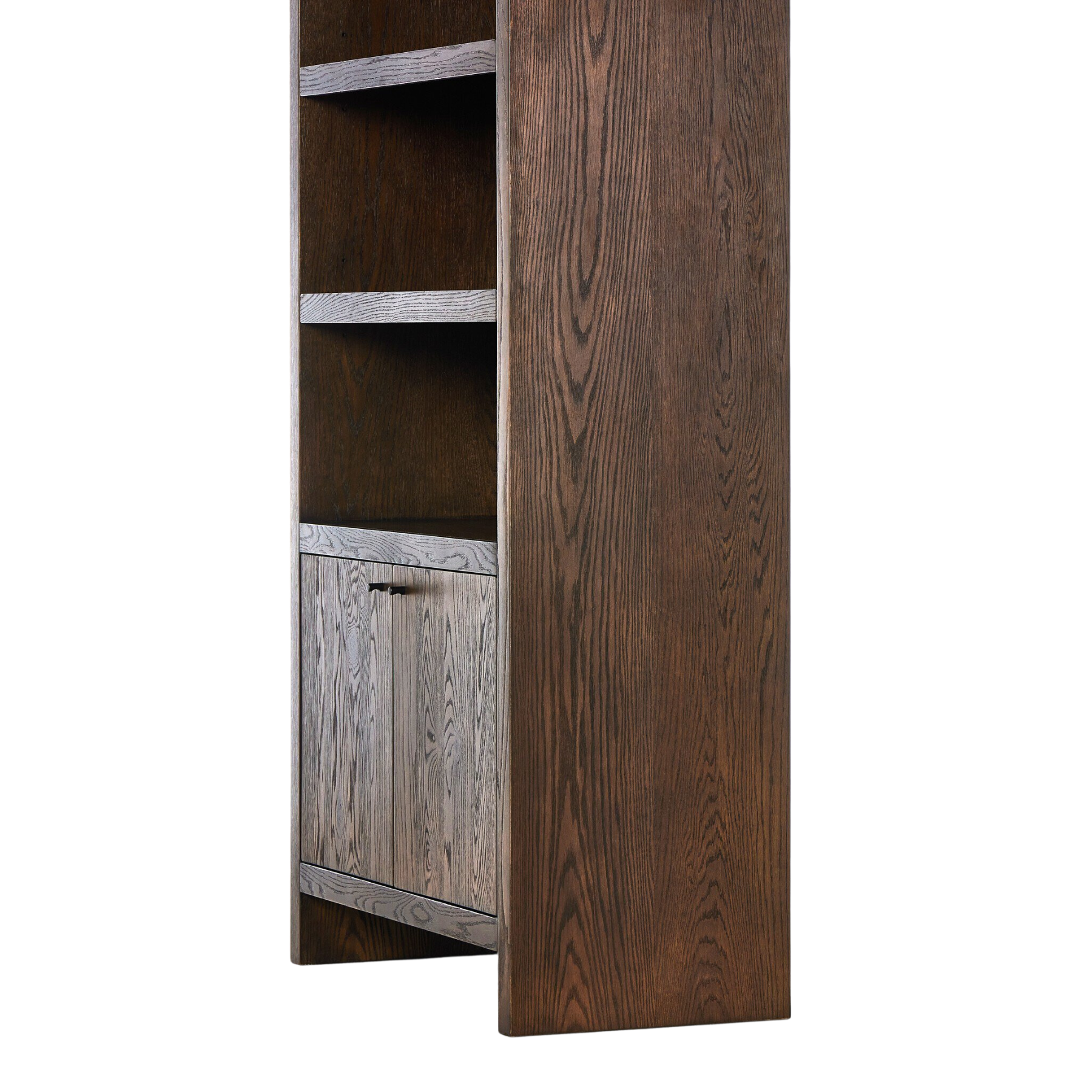 Elevate your space with the stylish Trinity Bookcase. Crafted from dark-finished oak, its four spacious shelves offer plenty of room for all your books and decor. And with a two-door cabinet below, you'll have even more storage options. Upgrade your organization game with the Trinity Bookcase.
