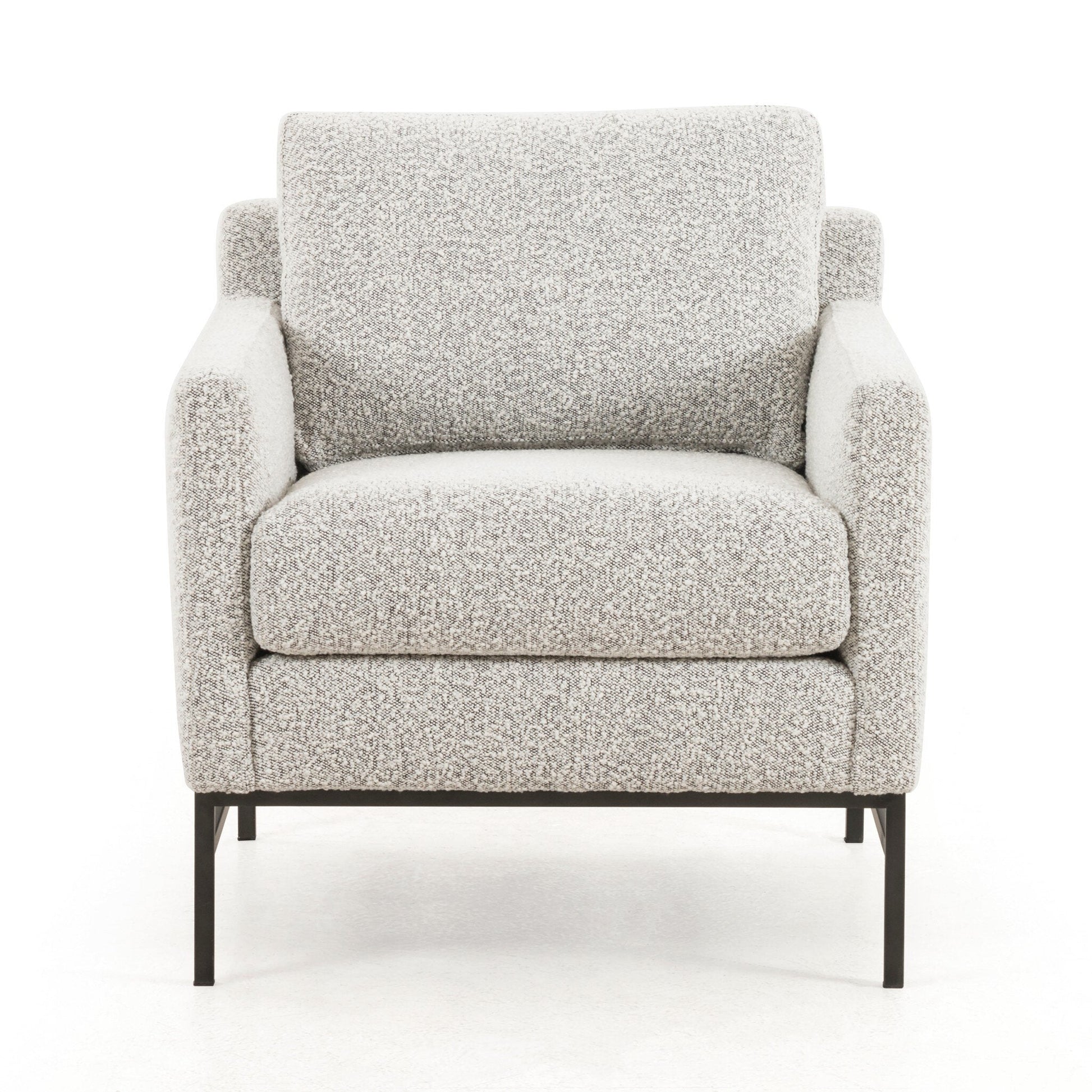 Plush and modern-minded. Atop an airy, black-finished iron base, thick, boucle-like upholstery features clean, angular track arms and comfy cushioning, for the best of both worlds.