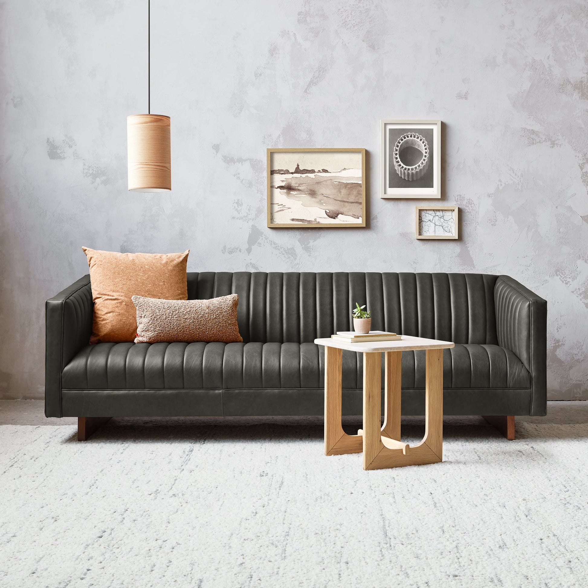 The Wallace 84' Sofa offers a contemporary take on the timeless English Chesterfield design. Its channel-stitched leather upholstery on the seat, back, and arms delivers a striking visual appeal combined with exceptional comfort. Featuring piping accents, gently sloped armrests, and a sculptural angular wooden base, this sofa balances modern style with luxurious channeled cushioning ideal for relaxing. Offered in two classic leather options, each selected for distinctive grain patterns that will mature gracefully, developing a rich, natural patina over time. Pairs elegantly with the Wallace Chair. Each leather hide is thoughtfully chosen for its unique, natural surface traits, ensuring every sofa is one of a kind.