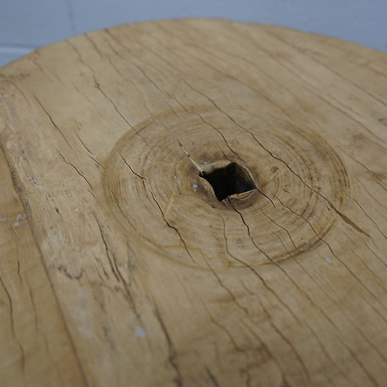 The Wells End Table - a true masterpiece of craftsmanship and vintage charm. Each Wells end table is a one-of-a-kind creation, featuring a distinctive vintage wooden wheel that adorns the tabletop, supported by three handcrafted legs.