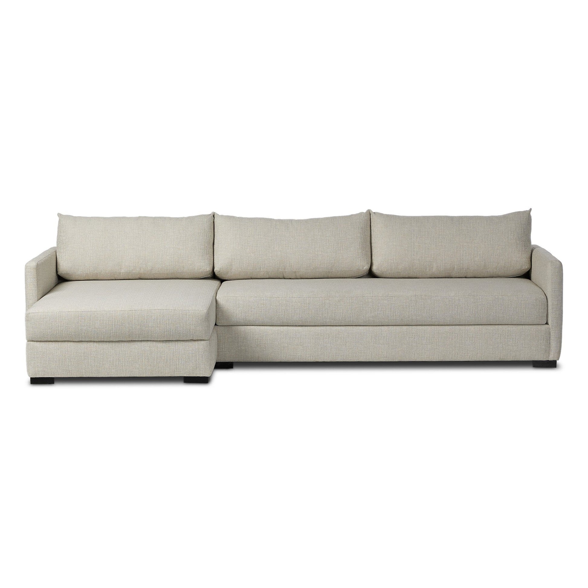 A simple, stylish silhouette redefines the classic sofa bed, now as a sectional. With knife-edge pillows and high-performance fabric, the sleeper mechanism remains discreetly concealed, allowing for an easy one-step pullout. When unfolded, the sectional cushions form a comfortable bed, perfect for overnight guests or cozy movie nights. Plus, the addition of a storage chaise offers ample space for blankets and pillows, easily accessed by lifting the front of the chaise cushion. Comfort, storage, and style all in one.