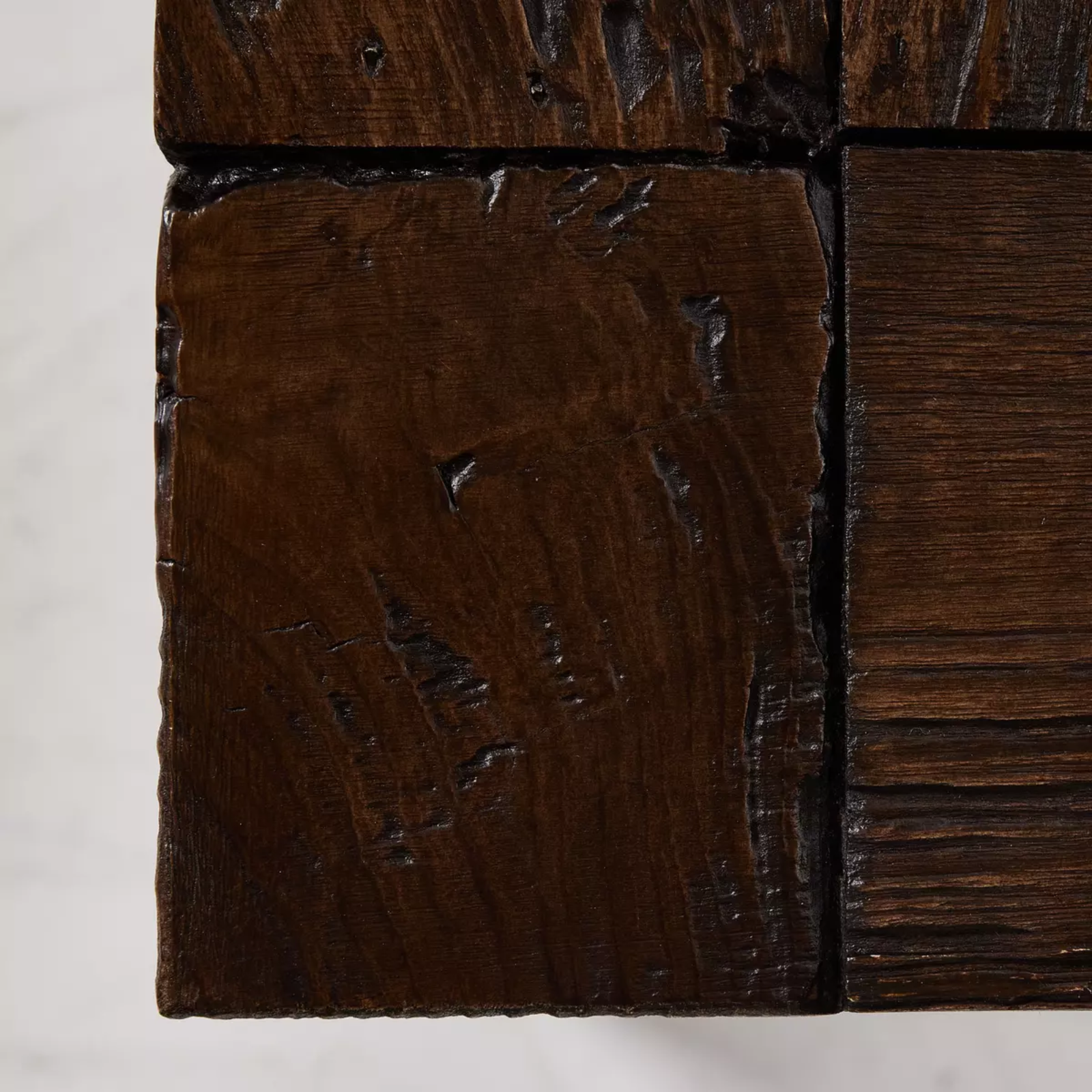 This sideboard features a rustic and wabi sabi-inspired design, crafted from a mix of solid and resawn wood. The framework has natural graining and grooves, with a smocked finish and raised built-in door pulls for an easier grip. Perfect for living spaces and dining areas, it makes a bold and luxurious statement while maintaining an organic and natural feel.