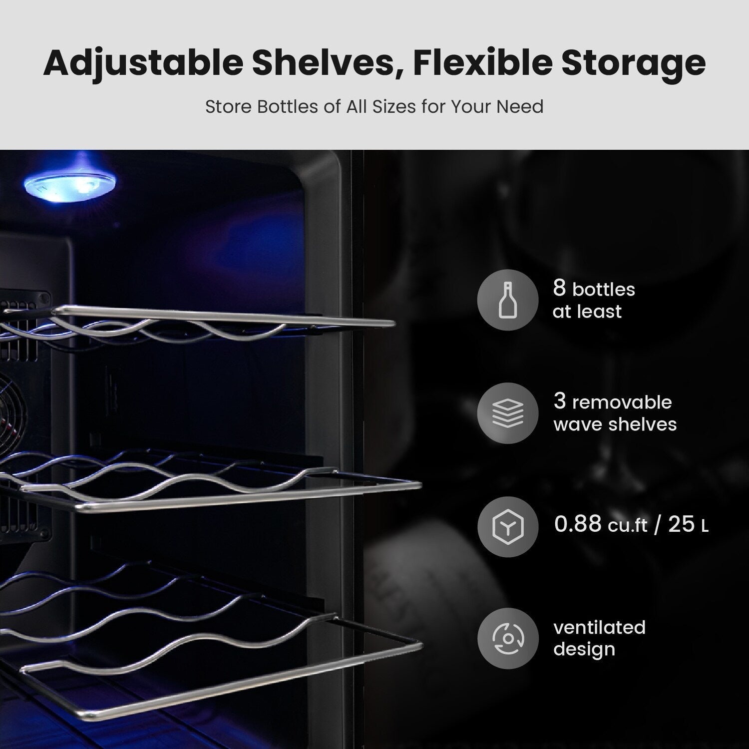• Versatile Storage: Accommodates 8 standard 750ml Bordeaux bottles with three removable wine racks, allowing flexibility for different bottle sizes and types.