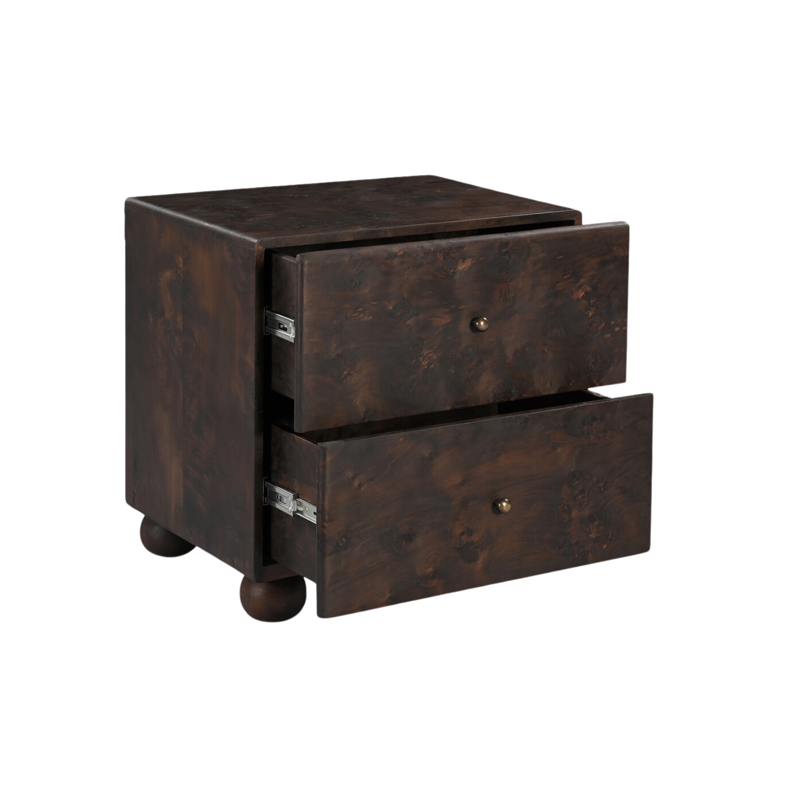 Introducing the Yen Nightstand, a timeless piece that celebrates the heritage and beauty of burl veneer and brass detailing. A true symbol of elegance and sophistication, this nightstand is perfect for storing your treasured heirlooms and adding a touch of luxury to your bedroom.