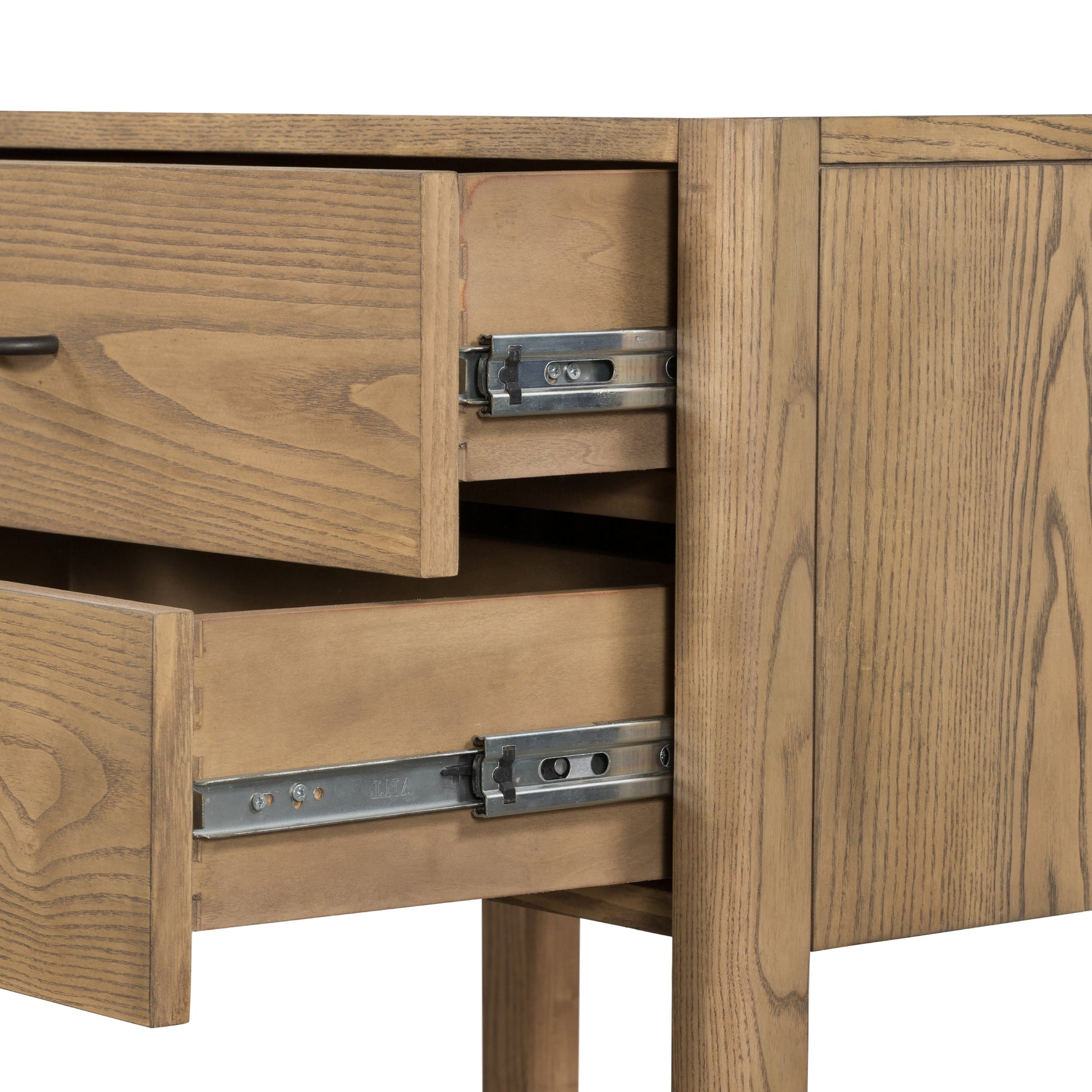 Simple yet refined, a Danish design-influenced nightstand is made from solid ash, with iron hardware finished in a sleek gunmetal. Dual drawers bring generous storage space to the bedside, while stretcher-style shelving made from woven paper cord doles a textural finishing touch.